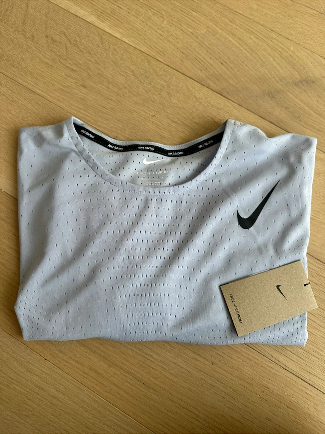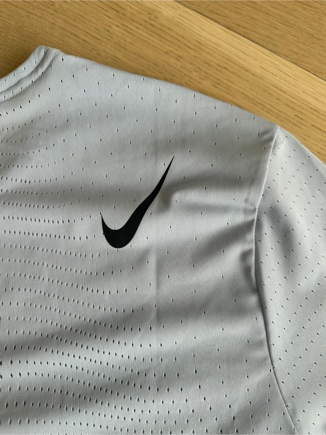 Light grey with purple undertones Nike Dri-FIT ADV running t-shirt. It's made with a breathable, perforated fabric. The material is lightweight and designed for performance. This shirt is great for hitting the pavement or the gym!