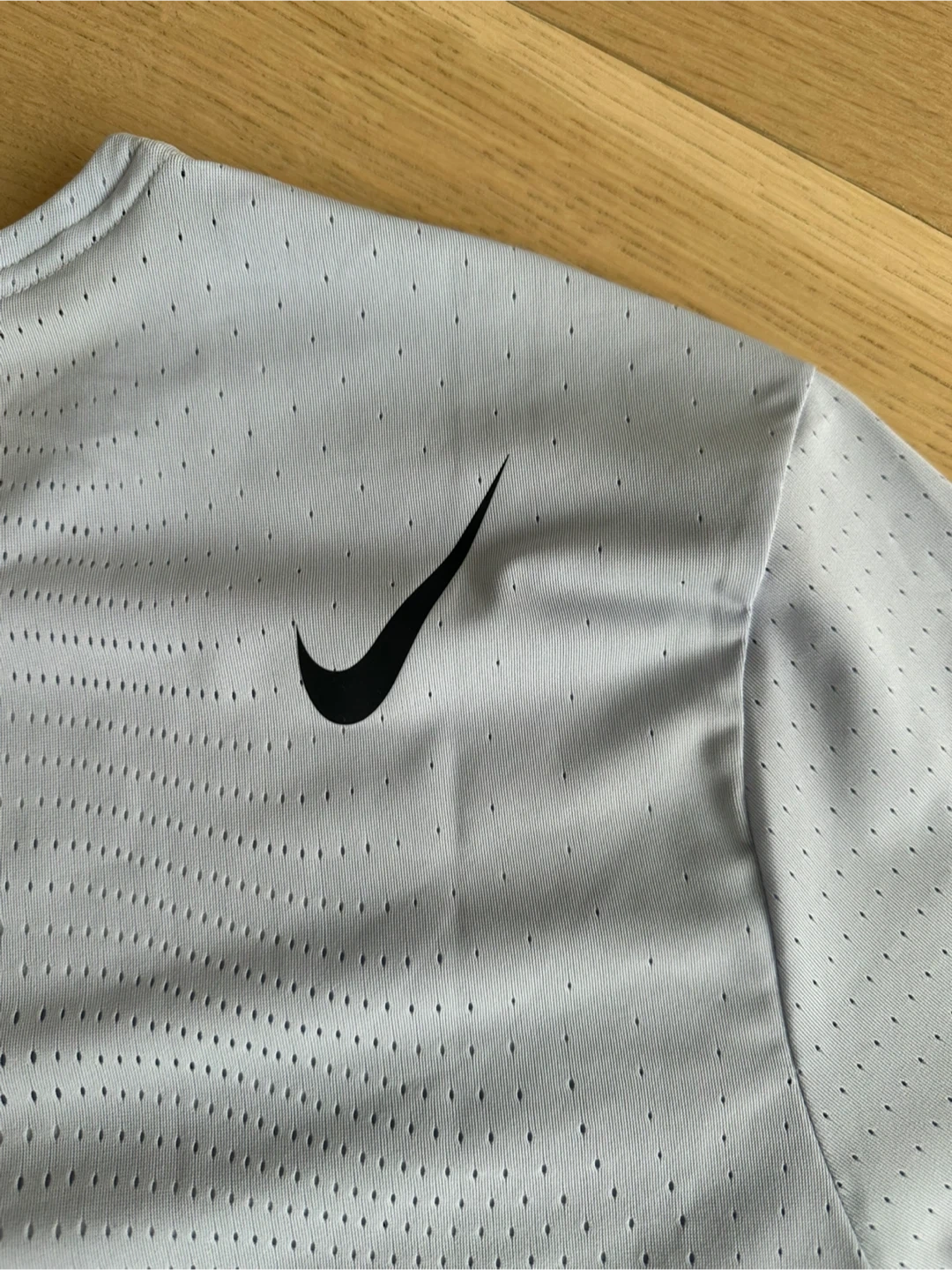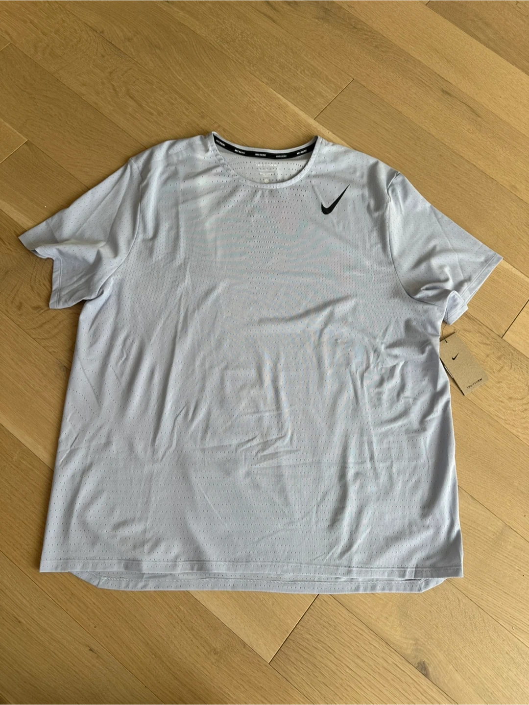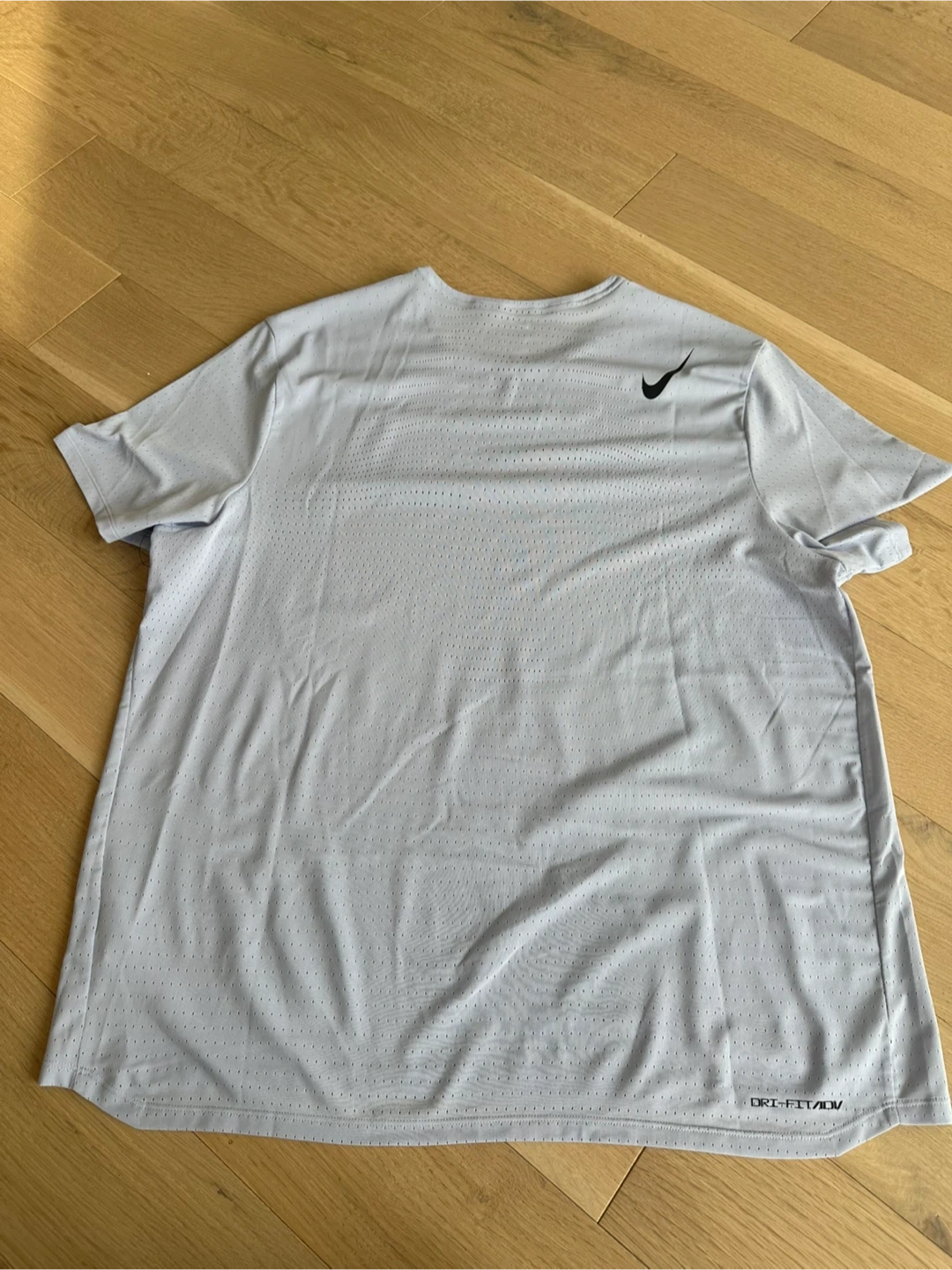 Light grey with purple undertones Nike Dri-FIT ADV running t-shirt. It's made with a breathable, perforated fabric. The material is lightweight and designed for performance. This shirt is great for hitting the pavement or the gym!