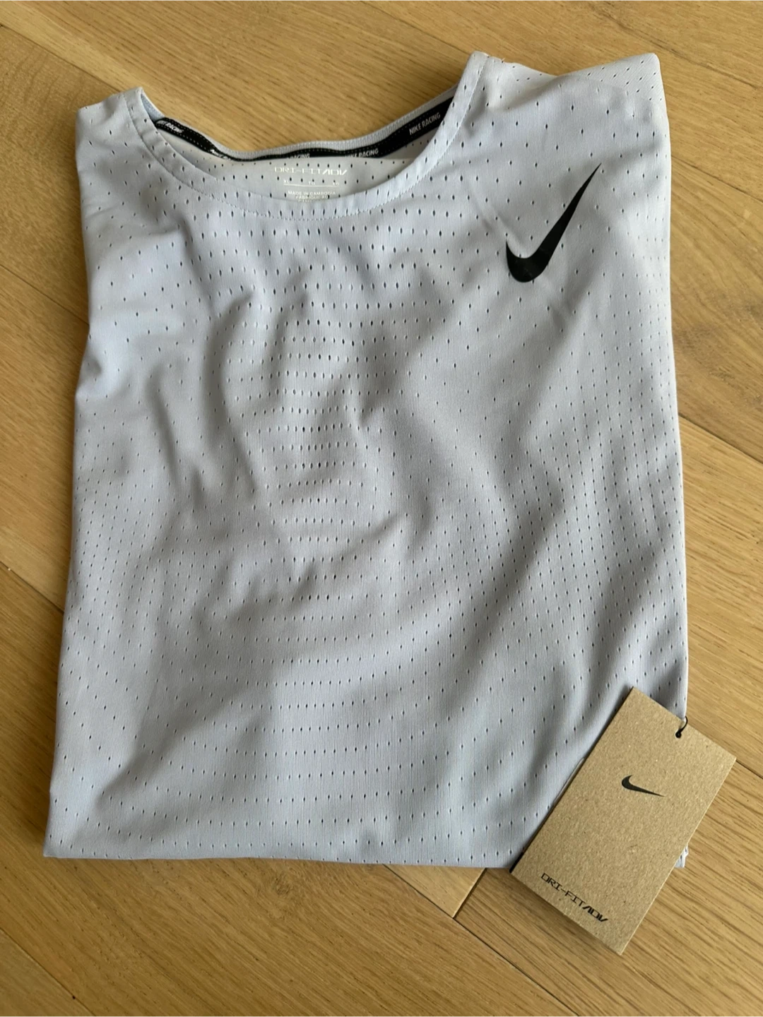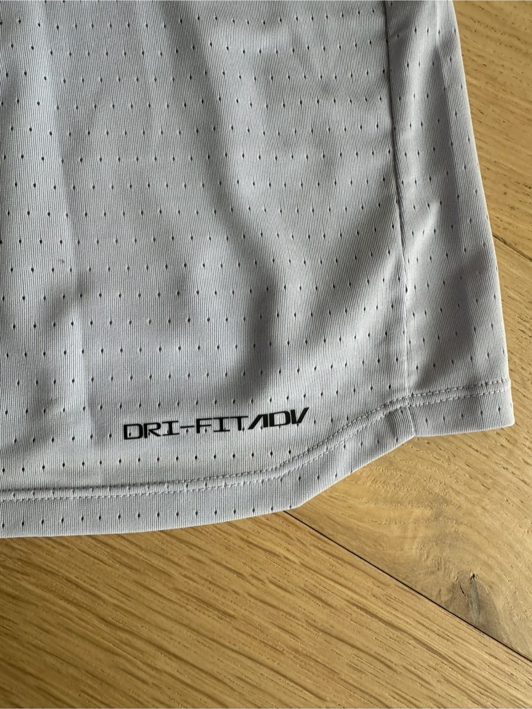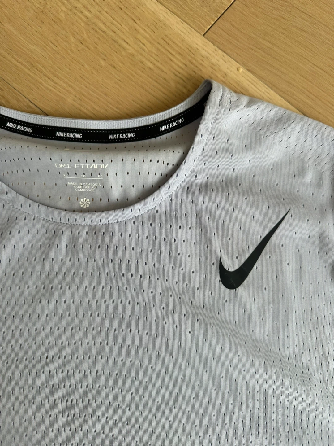 Light grey with purple undertones Nike Dri-FIT ADV running t-shirt. It's made with a breathable, perforated fabric. The material is lightweight and designed for performance. This shirt is great for hitting the pavement or the gym!