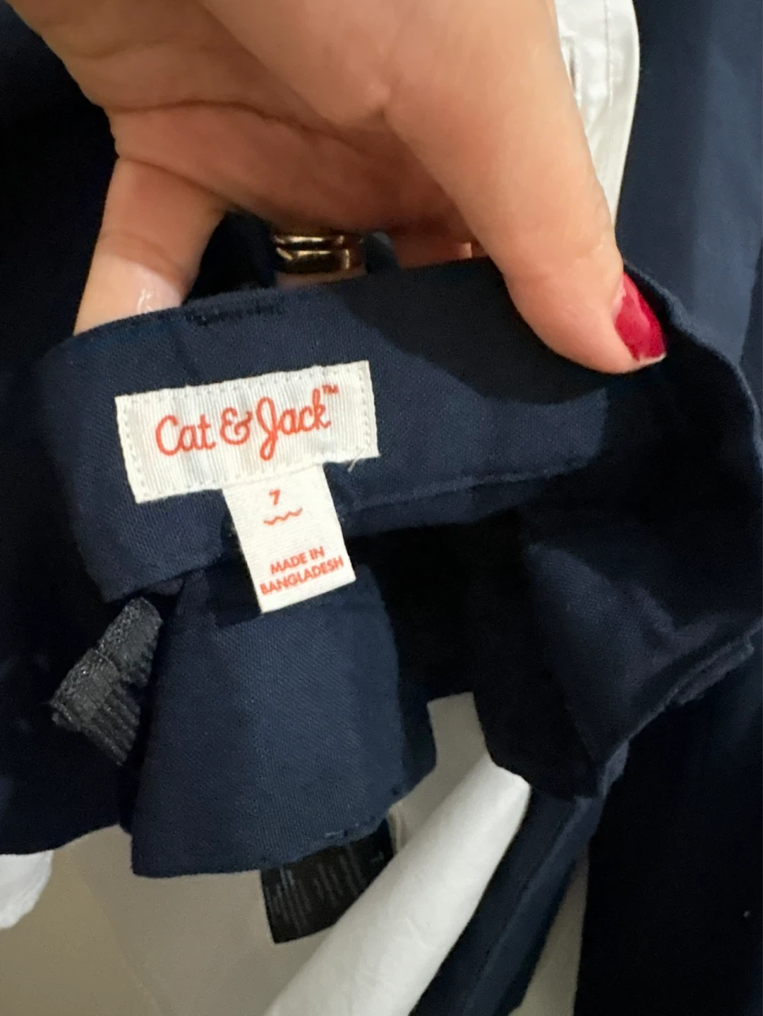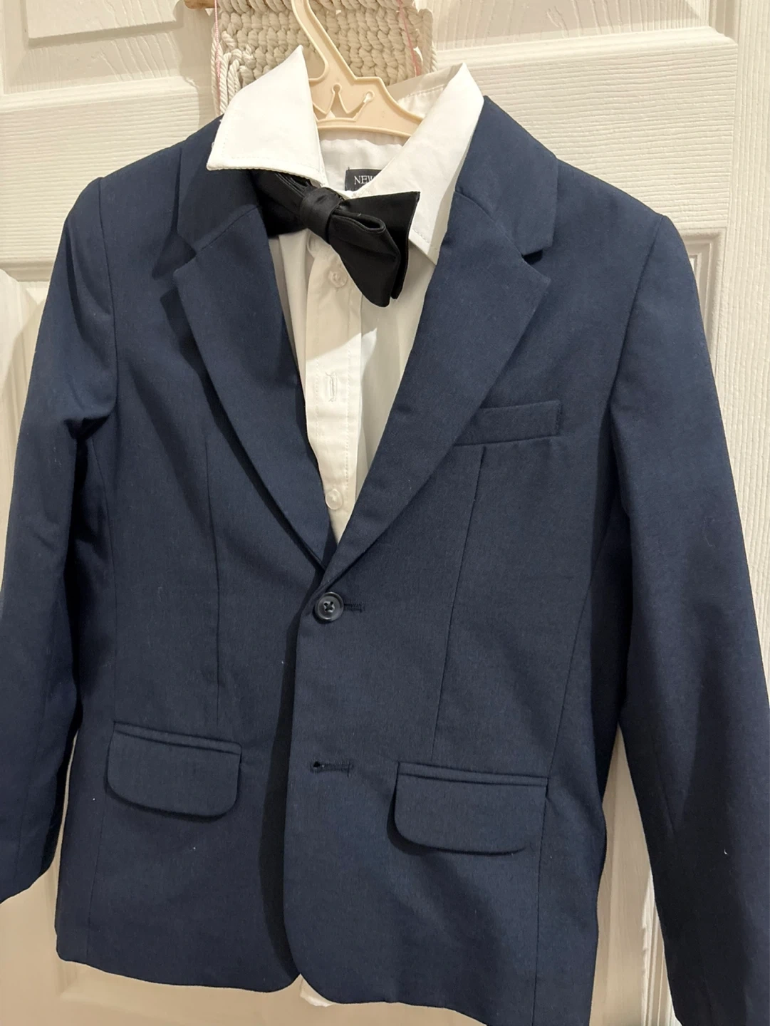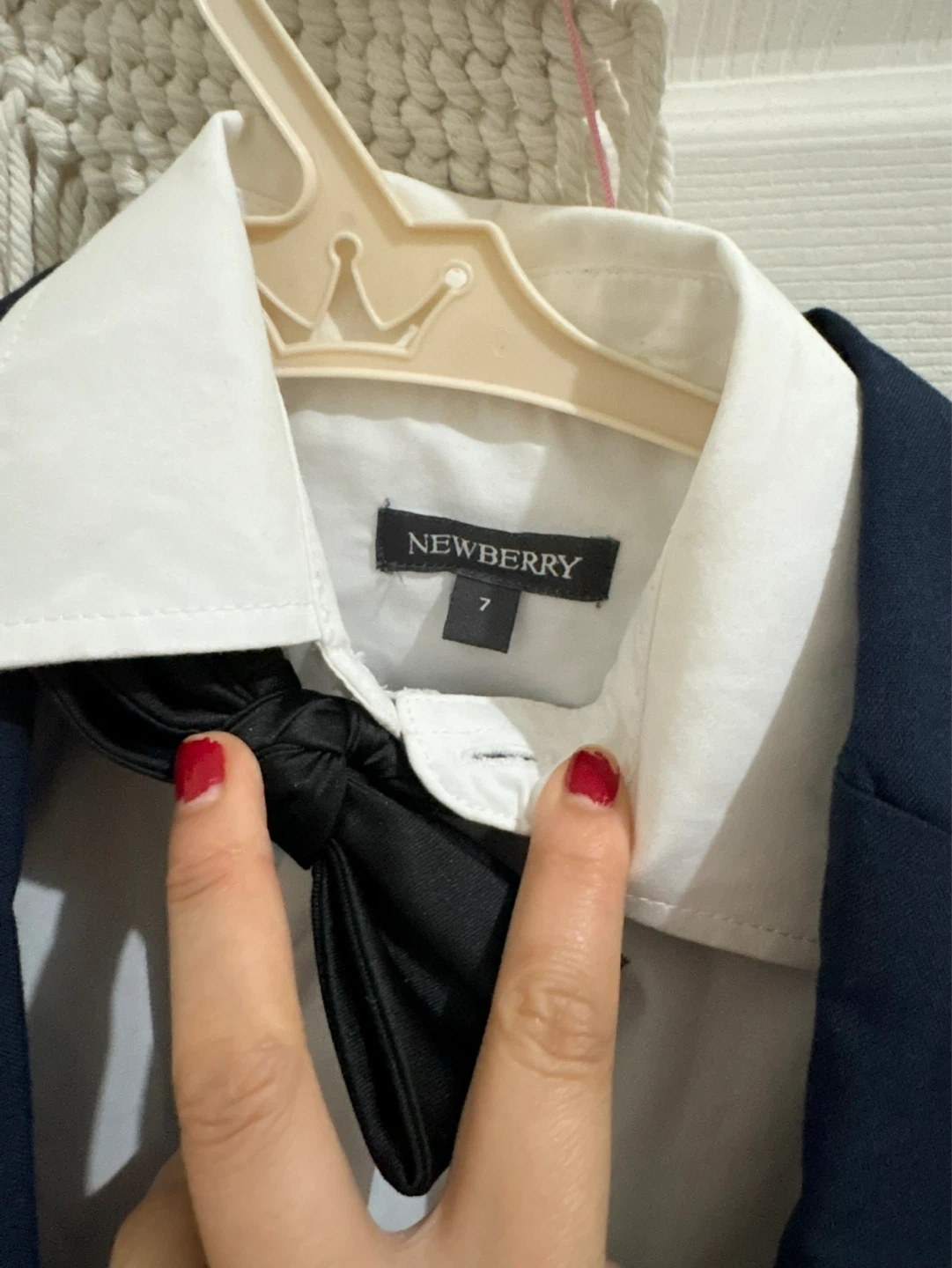 This boys' suit set includes a navy blazer, a white button-down shirt, and a black bowtie. The shirt is size 7 and made by Newberry, while the blazer has a Cat & Jack tag also indicating size 7. It's perfect for special occasions or dressy events!