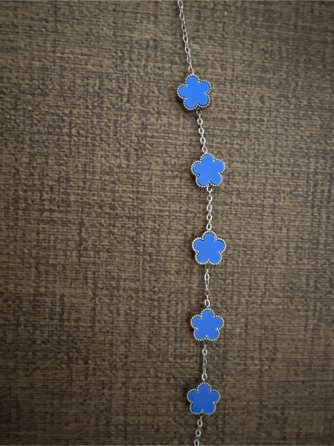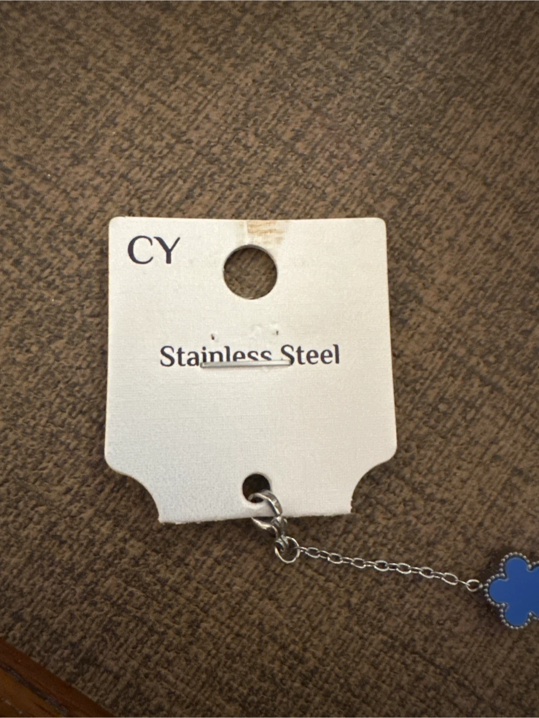 A lovely blue clover bracelet made from stainless steel. It's a delicate piece that adds a pop of colour. This bracelet is perfect for everyday wear!