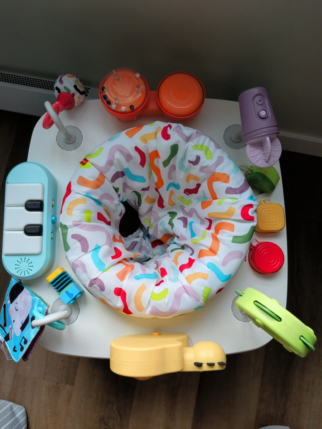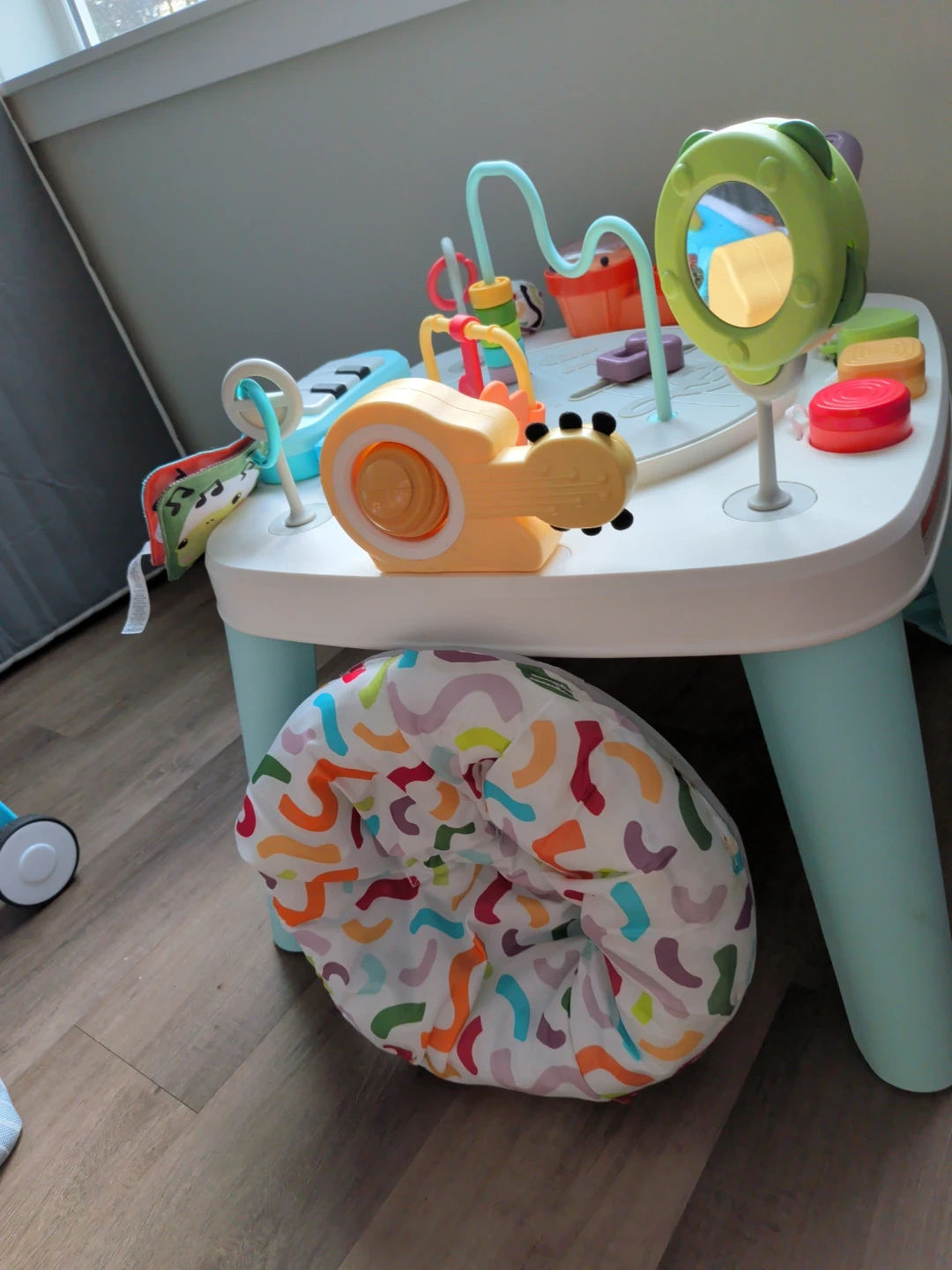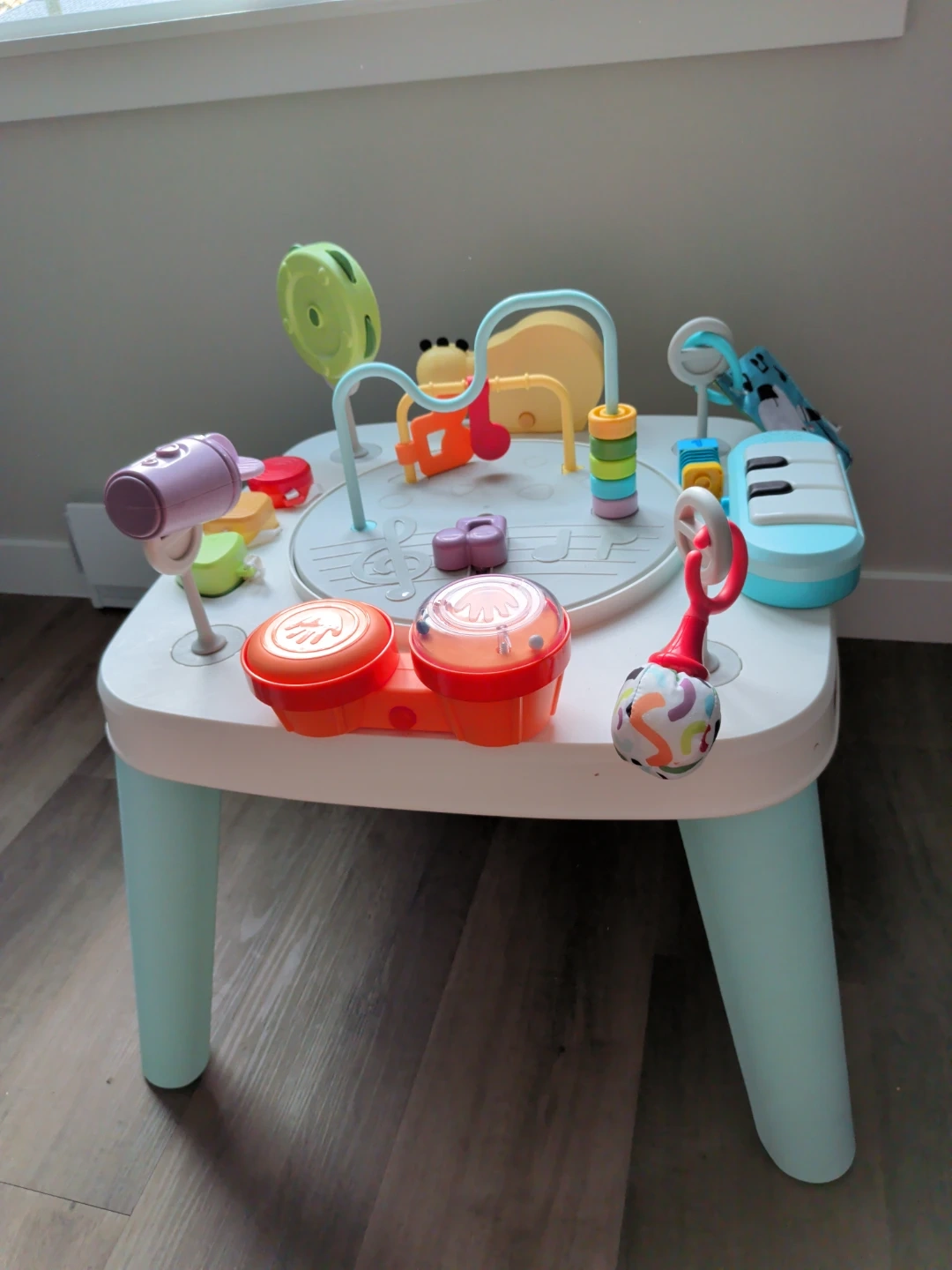 This Fisher-Price 3-in-1 Activity Table is perfect for little ones. It features a piano, drums, and a snail toy for endless entertainment. Includes a comfy seat for baby to play.