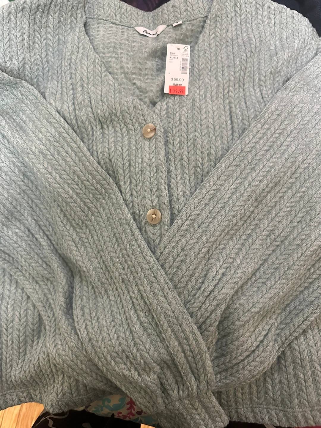 Light blue textured cardigan from Reitmans. It has a v-neck and button front closure. The material is soft and the fit is relaxed. Size L.