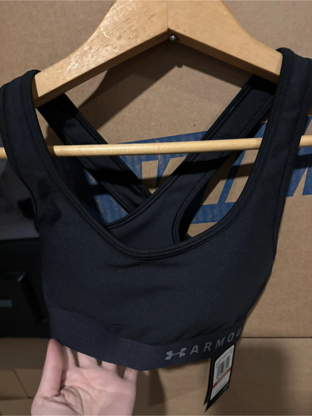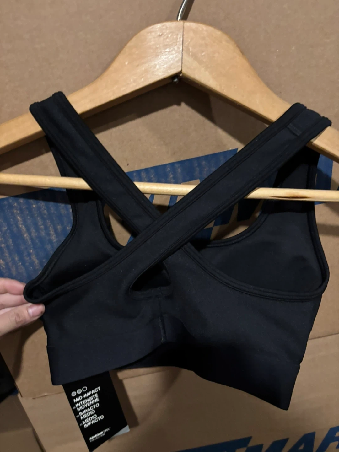 This is a black Under Armour sports bra. It's designed for mid-impact activities. Made from a comfortable, breathable fabric.