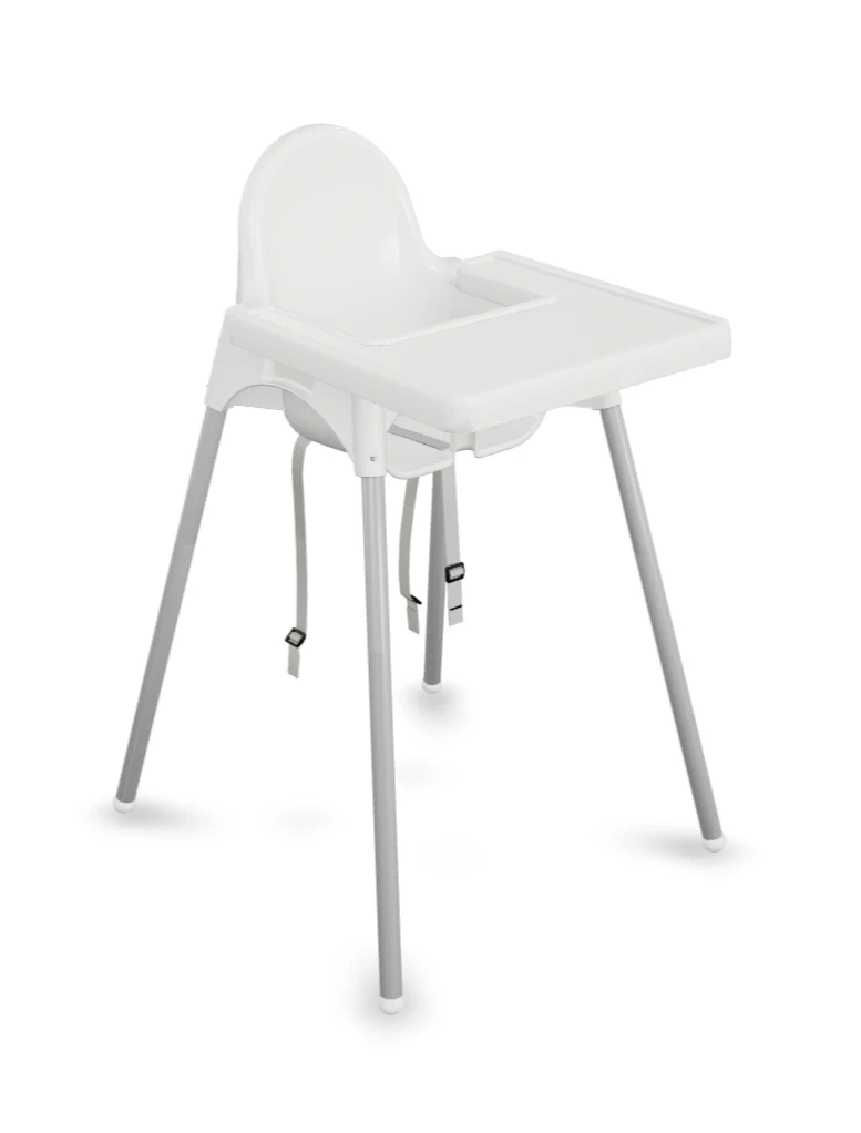 A white plastic highchair with *with tray & seatbelts!*. The tray is removable and washable. Easy To Clean, Easy To Disassemble & Transport. Very Good Condition. This product is intended for children able to sit up unaided and up to 3 years old or a maximum weight of 33 lbs.