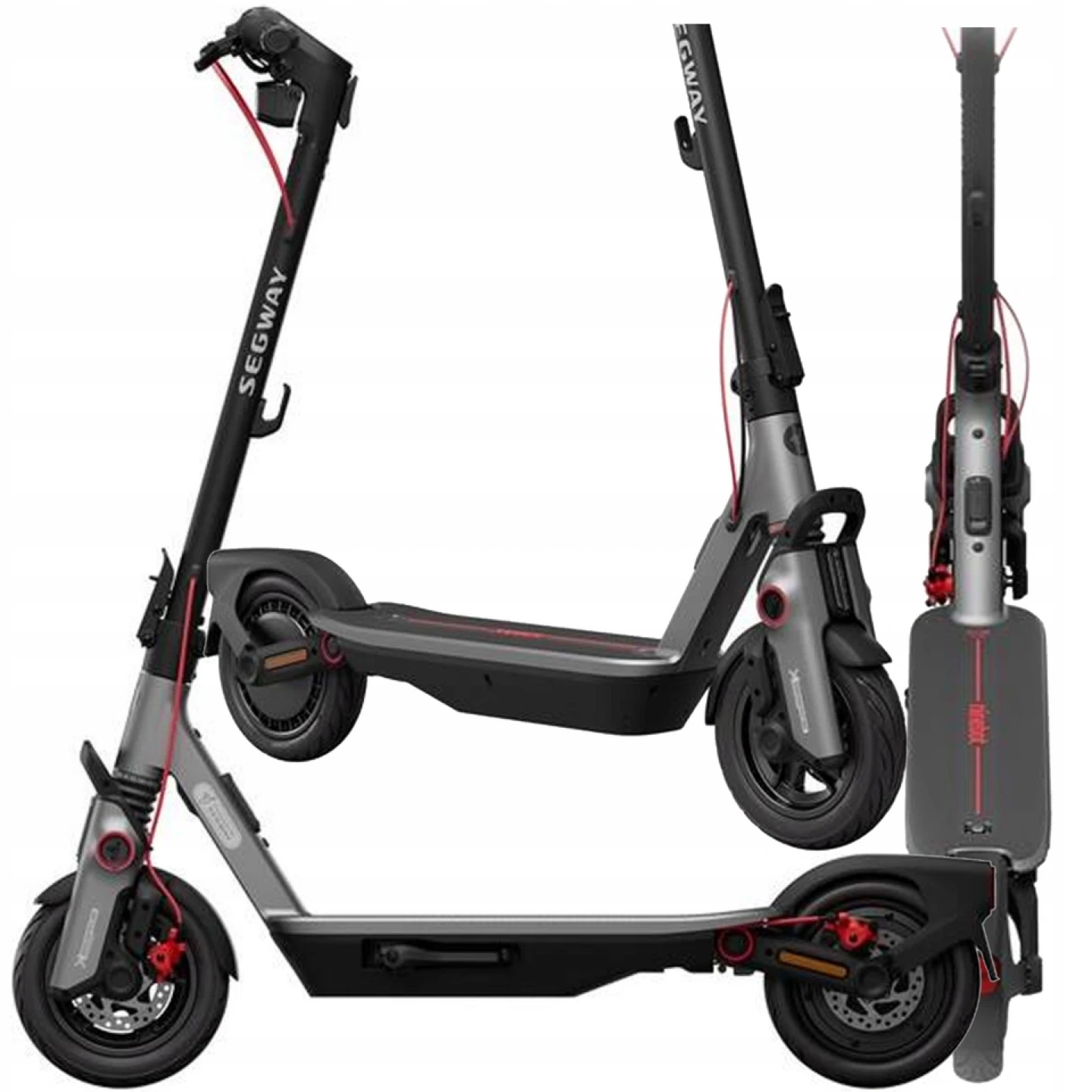 Segway Ninebot electric kickscooter in grey. It's powered by a rechargeable battery and has a sturdy frame. This scooter is great for getting around town!