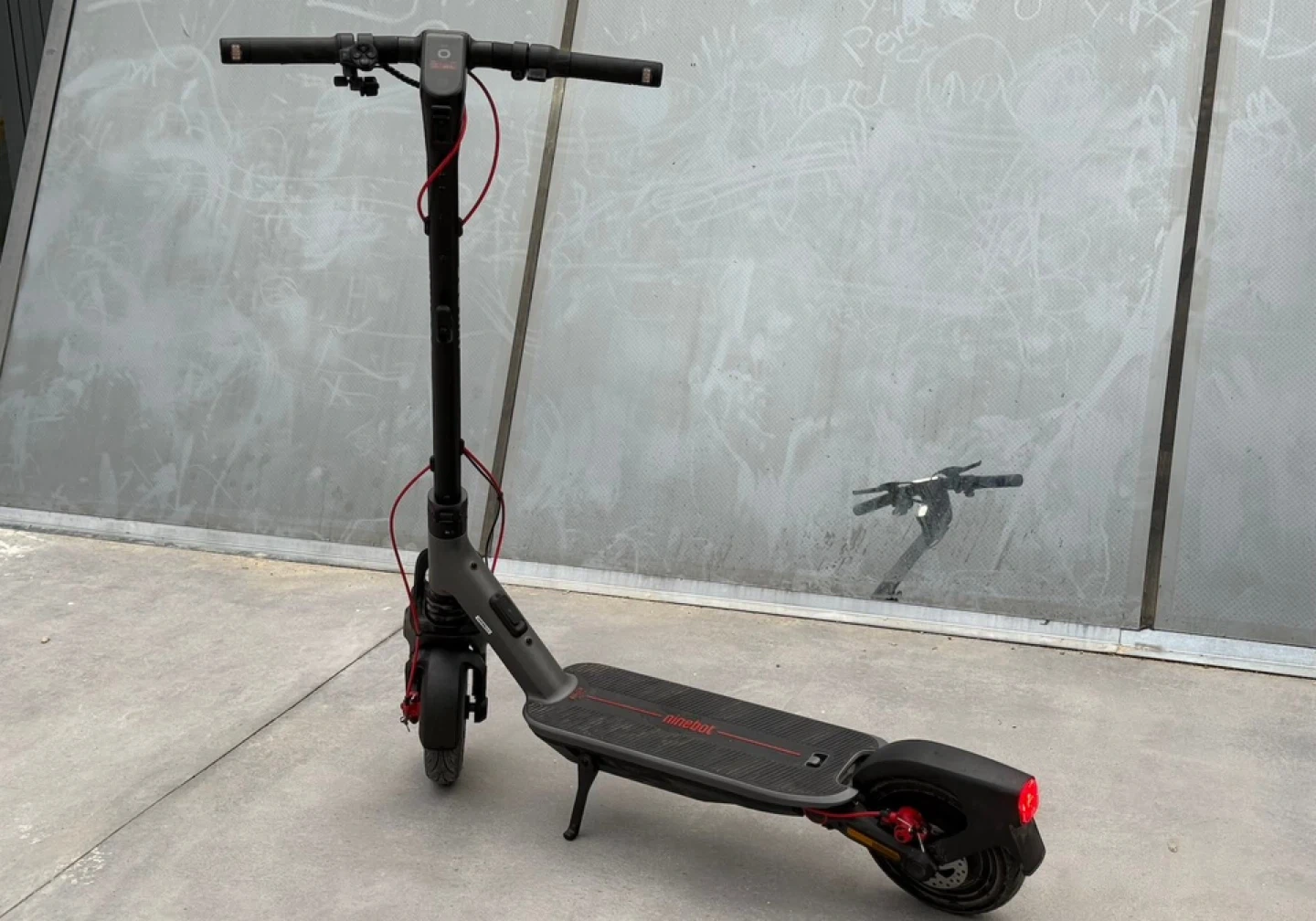 Segway Ninebot electric kickscooter in grey. It's powered by a rechargeable battery and has a sturdy frame. This scooter is great for getting around town!