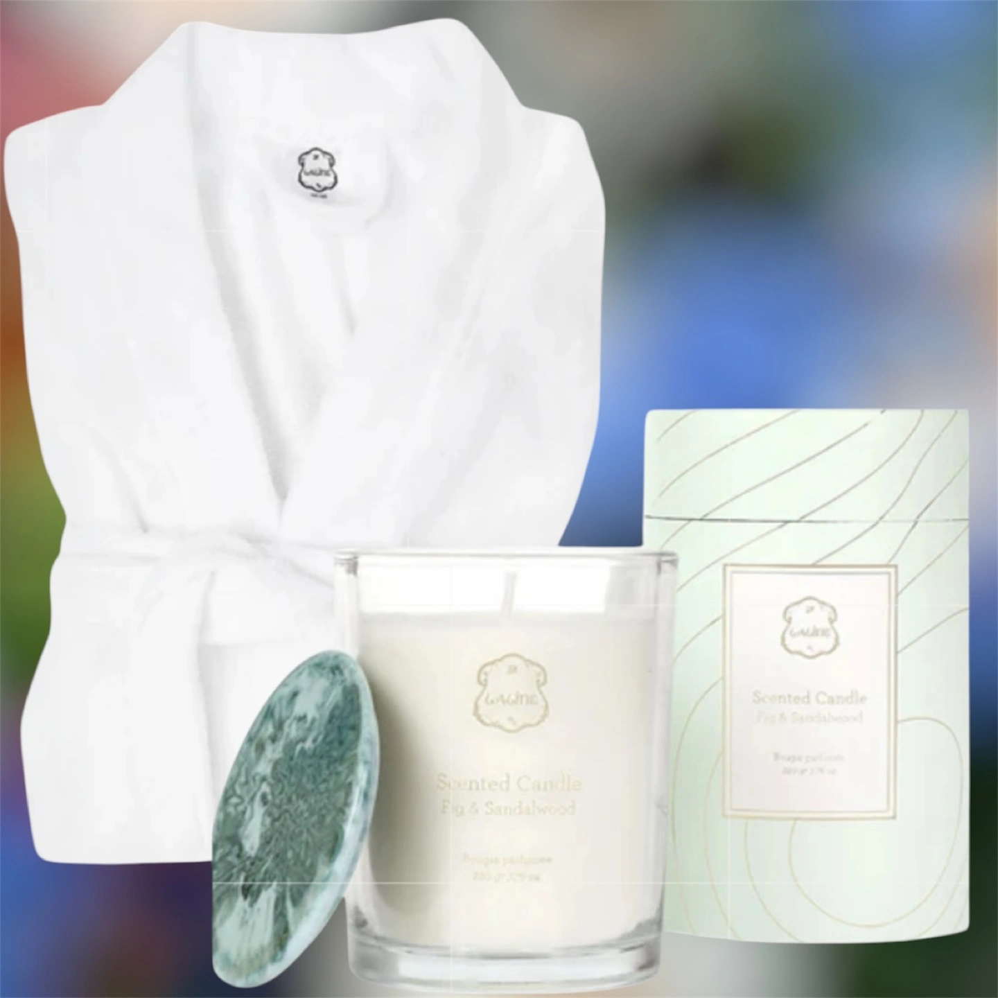 Relaxing spa set. Includes a soft white bathrobe and a fig & sandalwood scented candle. Perfect gift or self-care treat. Unisex New. Multiple available