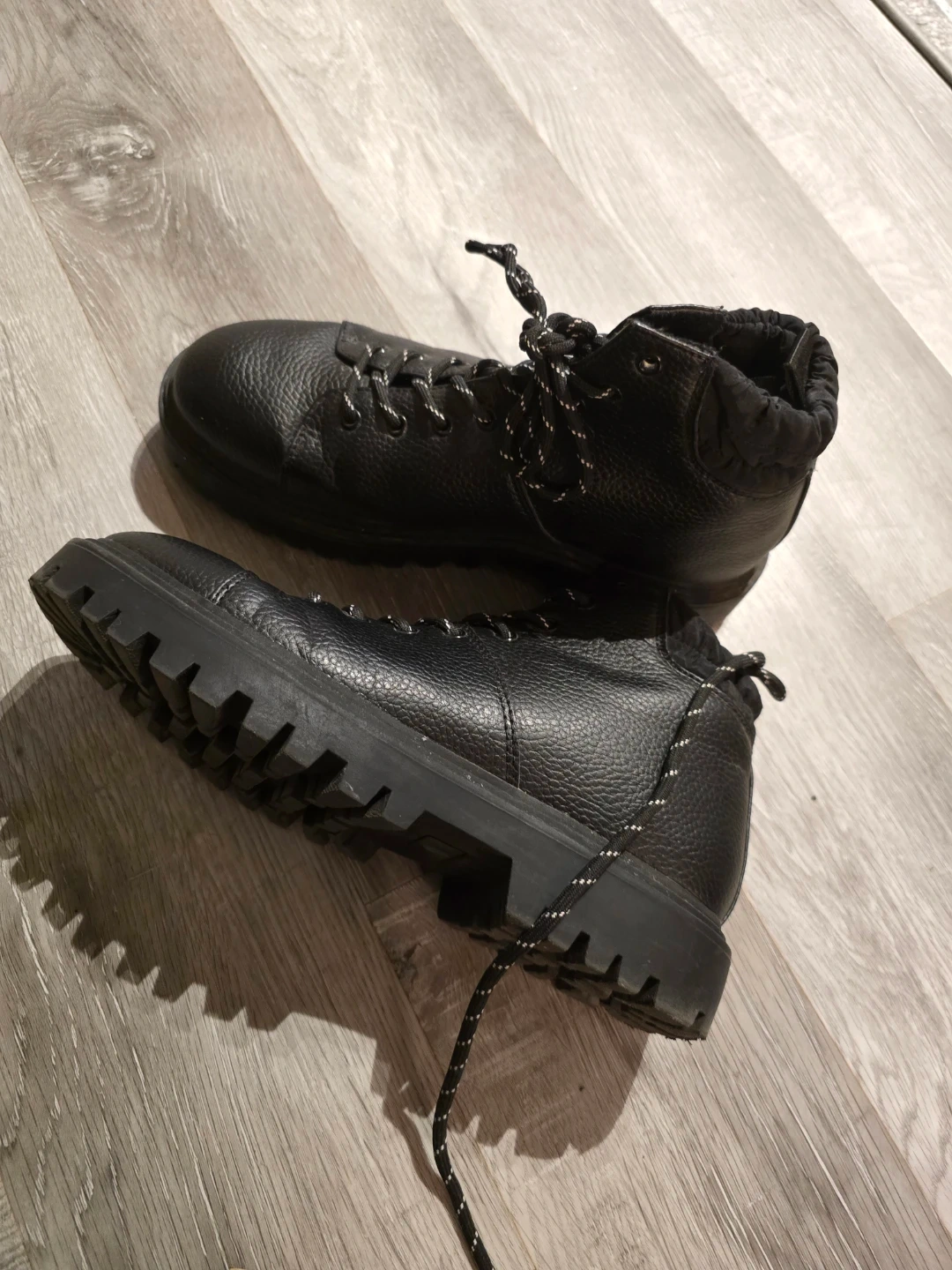 Pair of black leather boots with sturdy soles and laces. These boots are made of genuine leather and feature a padded collar for extra comfort. They're great for everyday wear.