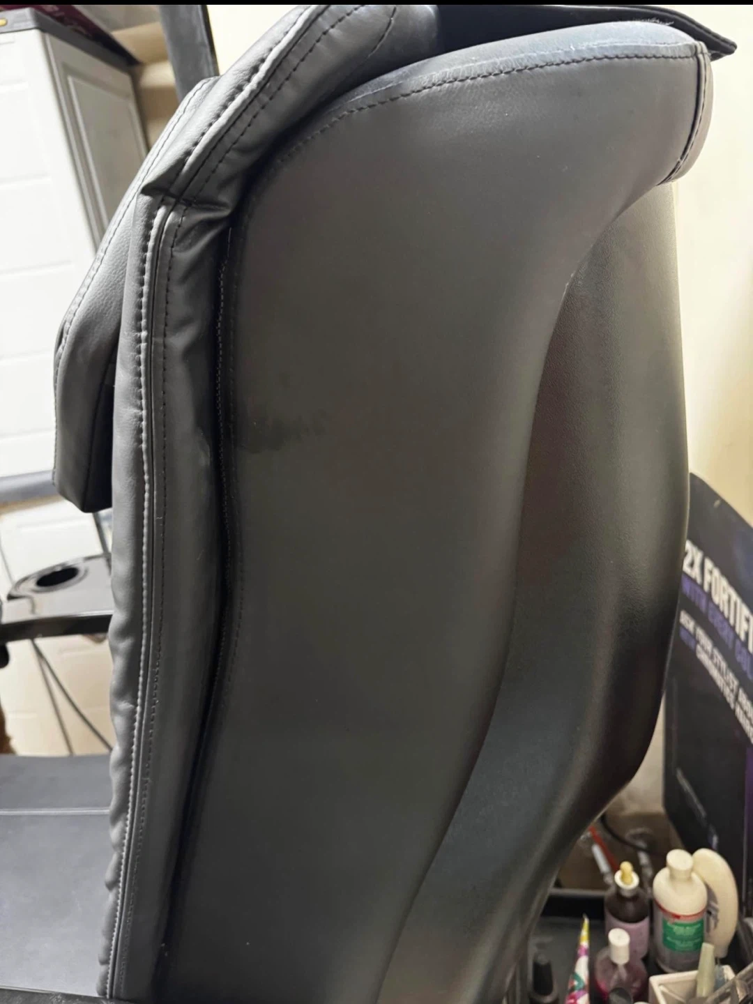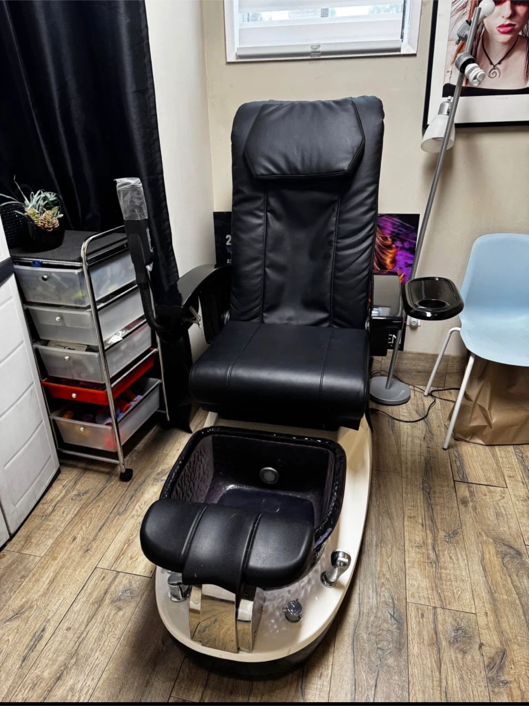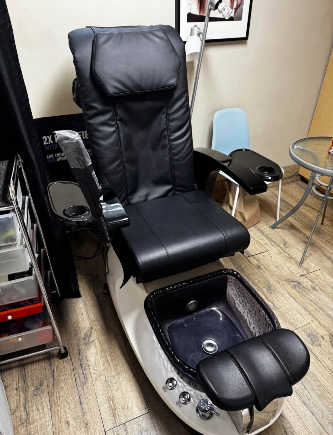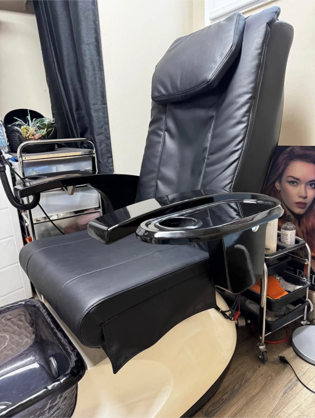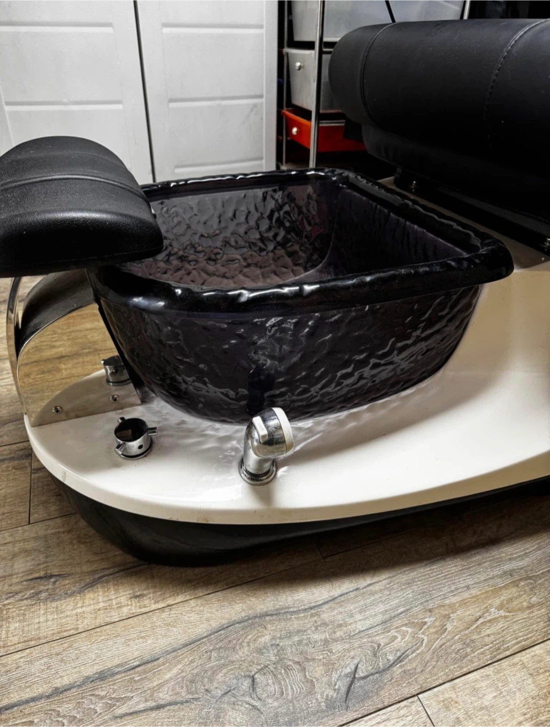This black leather pedicure chair features a built-in foot bath and massage function for ultimate relaxation. It comes with a remote control for easy operation. It's perfect for salons or home use.