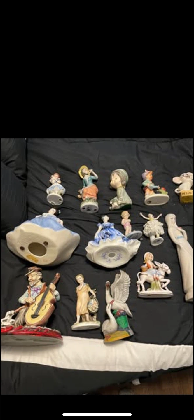 A charming assortment of ceramic figurines, featuring various characters and scenes. This collection includes detailed pieces like a musician, dancers, and everyday figures. They're great for display or adding a decorative touch to any shelf. 28 various items and sizes
