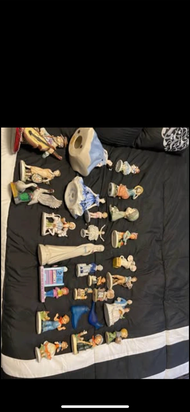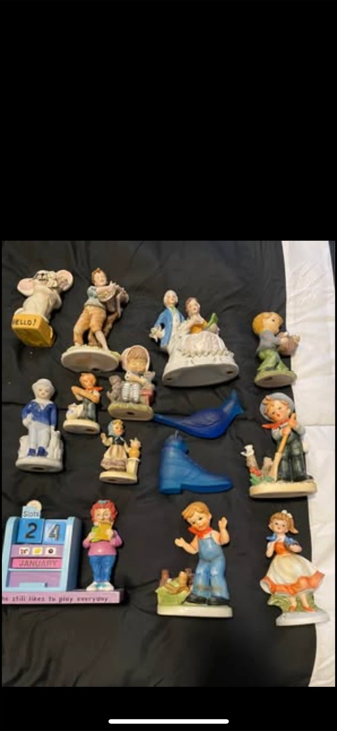 A charming assortment of ceramic figurines, featuring various characters and scenes. This collection includes detailed pieces like a musician, dancers, and everyday figures. They're great for display or adding a decorative touch to any shelf. 28 various items and sizes
