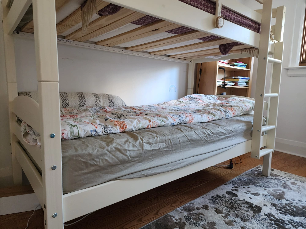 Beatiful solid wood bunkbed twin over twin with a ladder. warm white color.