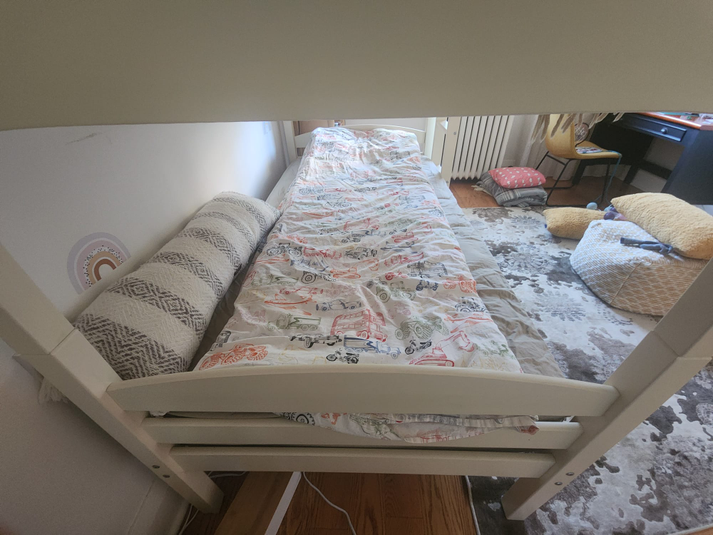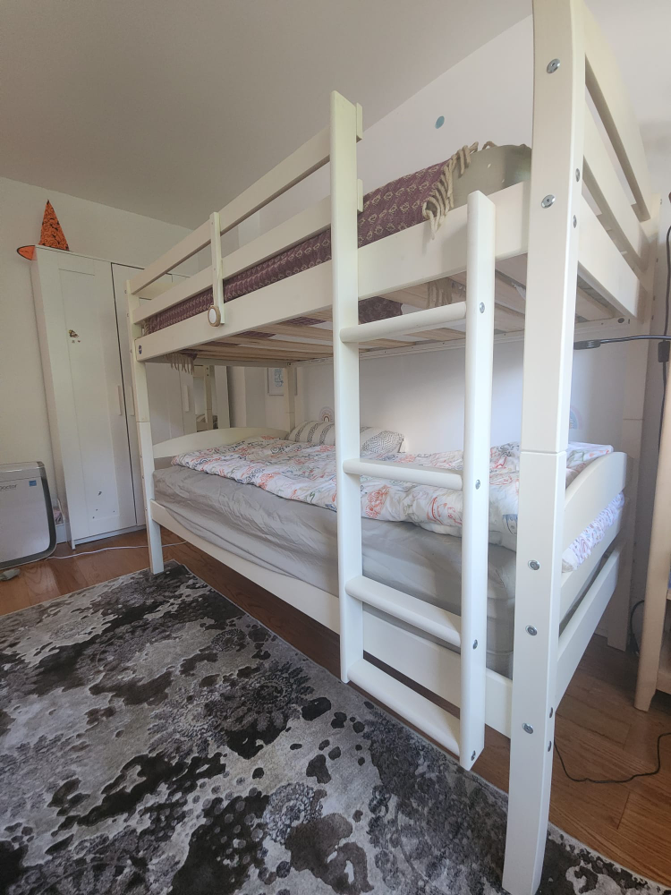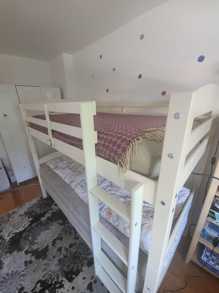 Beatiful solid wood bunkbed twin over twin with a ladder. warm white color.