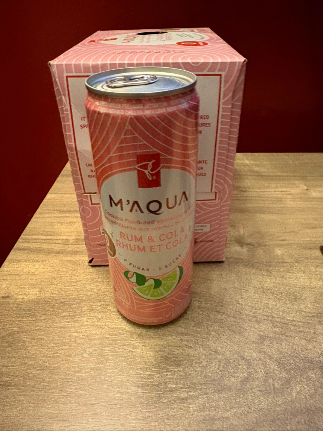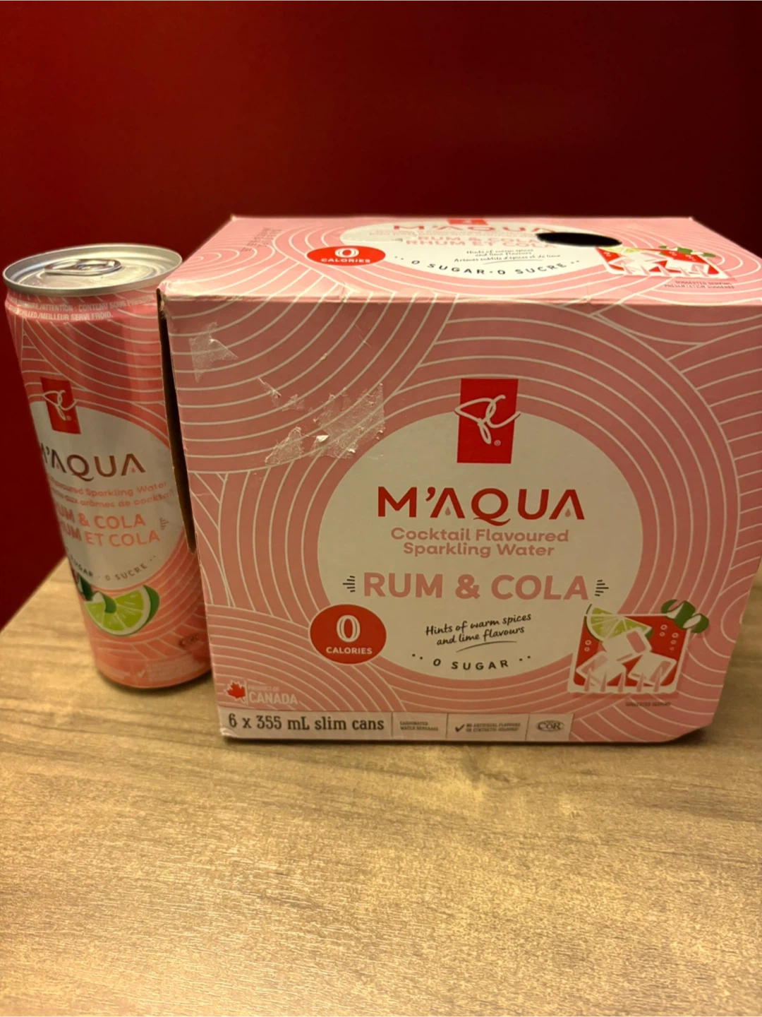 Enjoy M'Quva Rum & Cola non alcoholic cocktail flavoured sparkling water. It's made with 0 sugar and 0 calories. Best before date is June 24, 2026. This pack contains 6 x 355ml slim cans.
