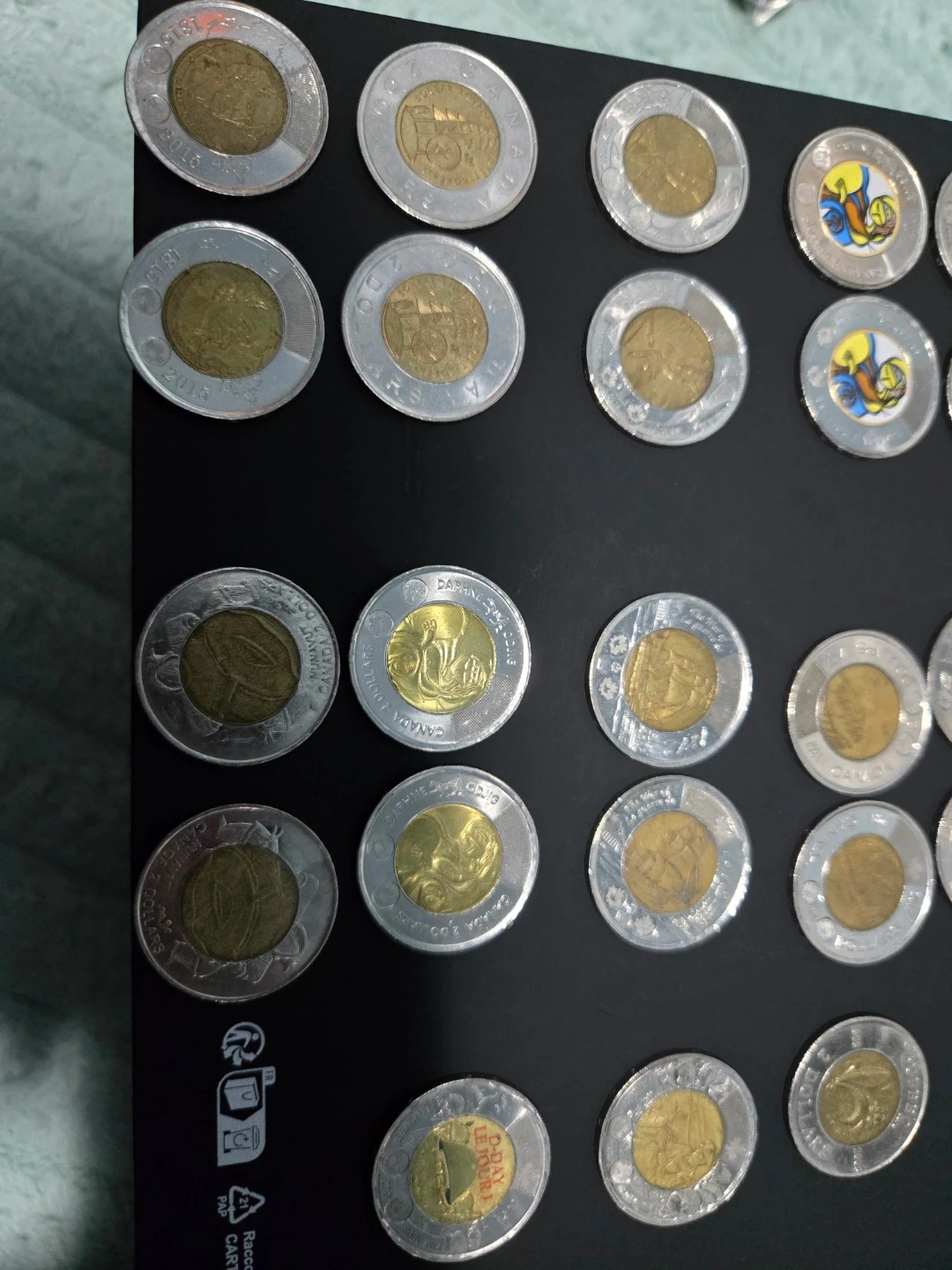 A collection of various Canadian commemorative coins. Includes designs featuring Indigenous art, military themes, and national symbols. These coins are perfect for collectors or for showcasing Canadian heritage.
