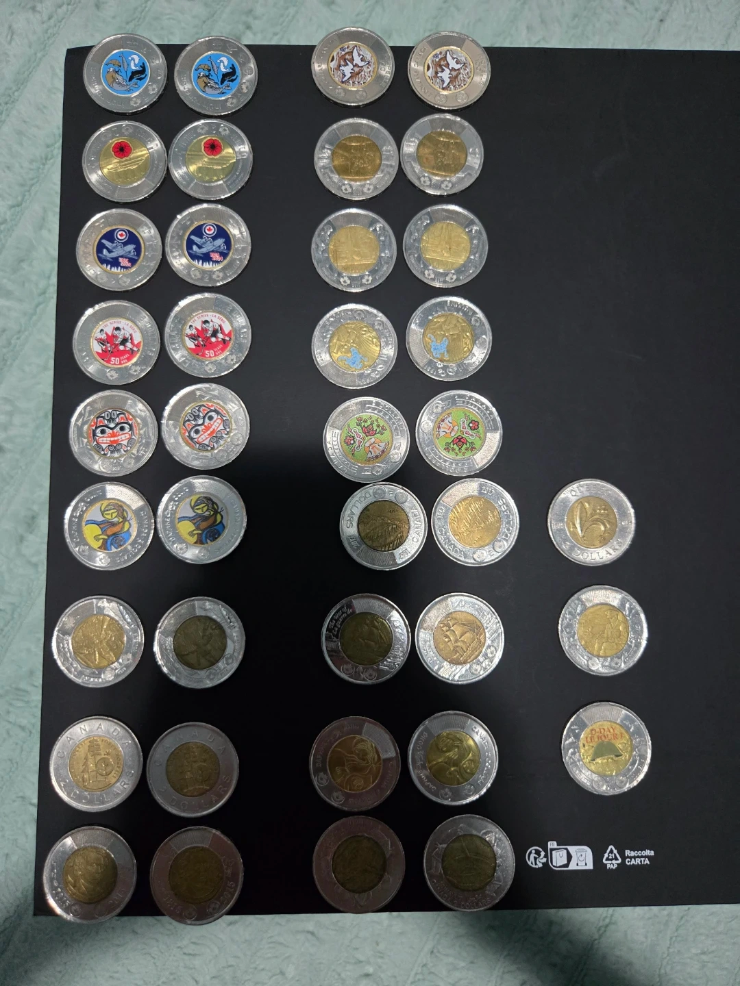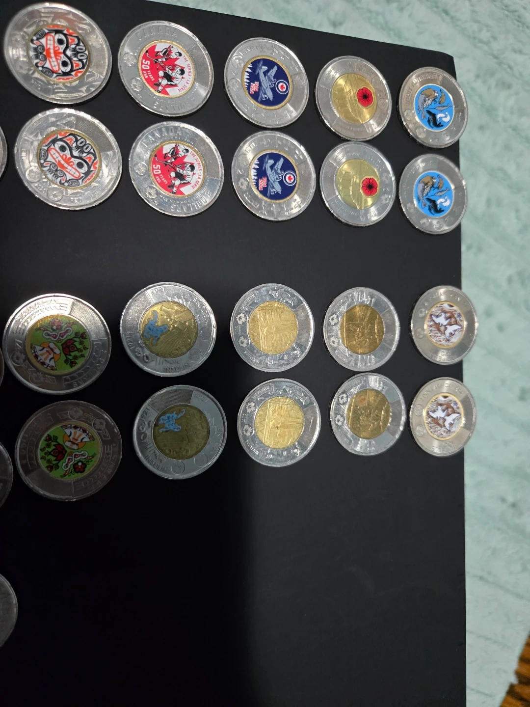A collection of various Canadian commemorative coins. Includes designs featuring Indigenous art, military themes, and national symbols. These coins are perfect for collectors or for showcasing Canadian heritage.