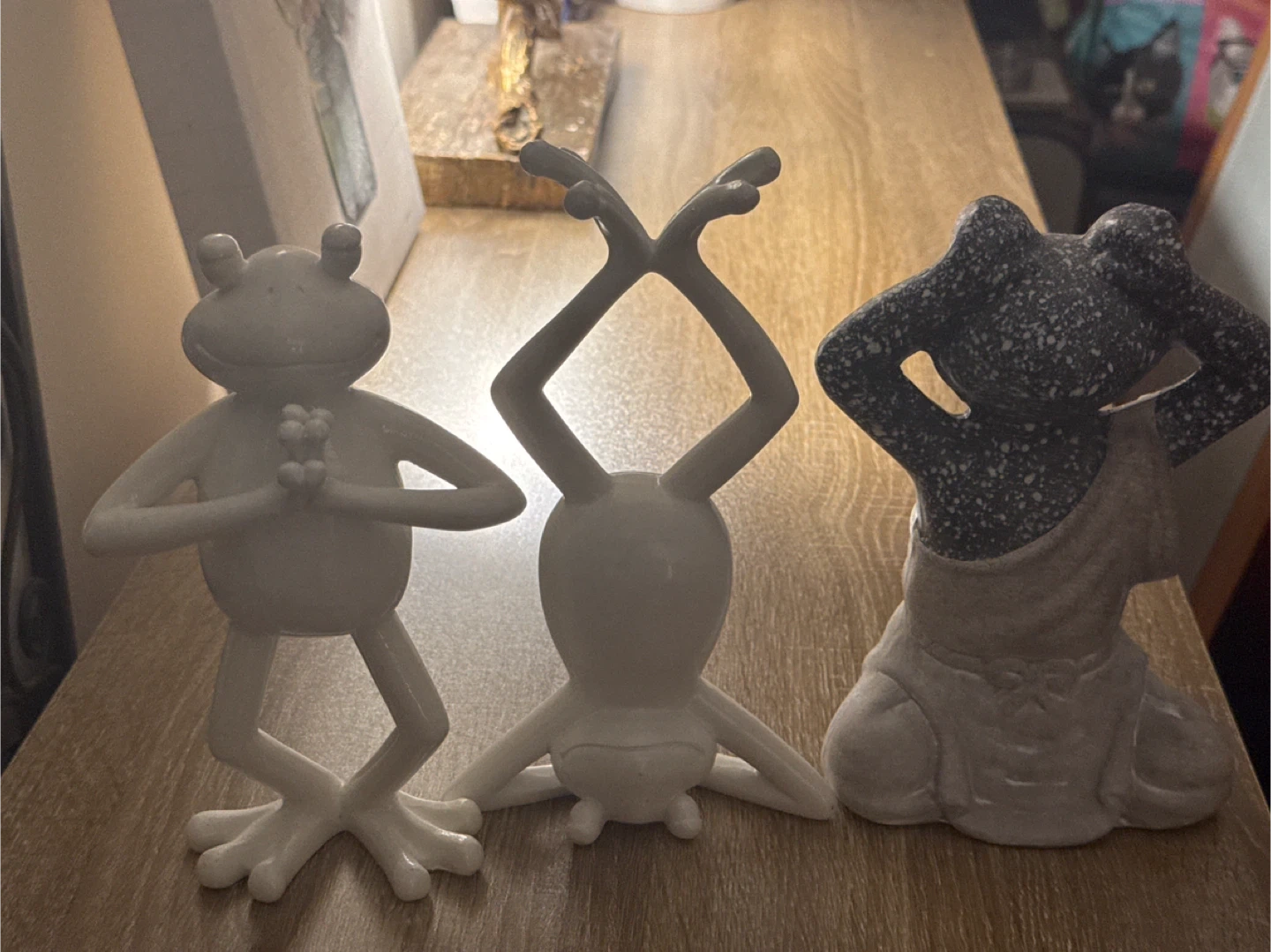 This set includes three charming frog figurines, each with a unique pose. One frog is dark gray with white speckles and wears a light gray draped cloth. The other two frogs are white, with one in a yoga pose and the other upside down. They're made of a durable material and offer a whimsical touch to any decor.
