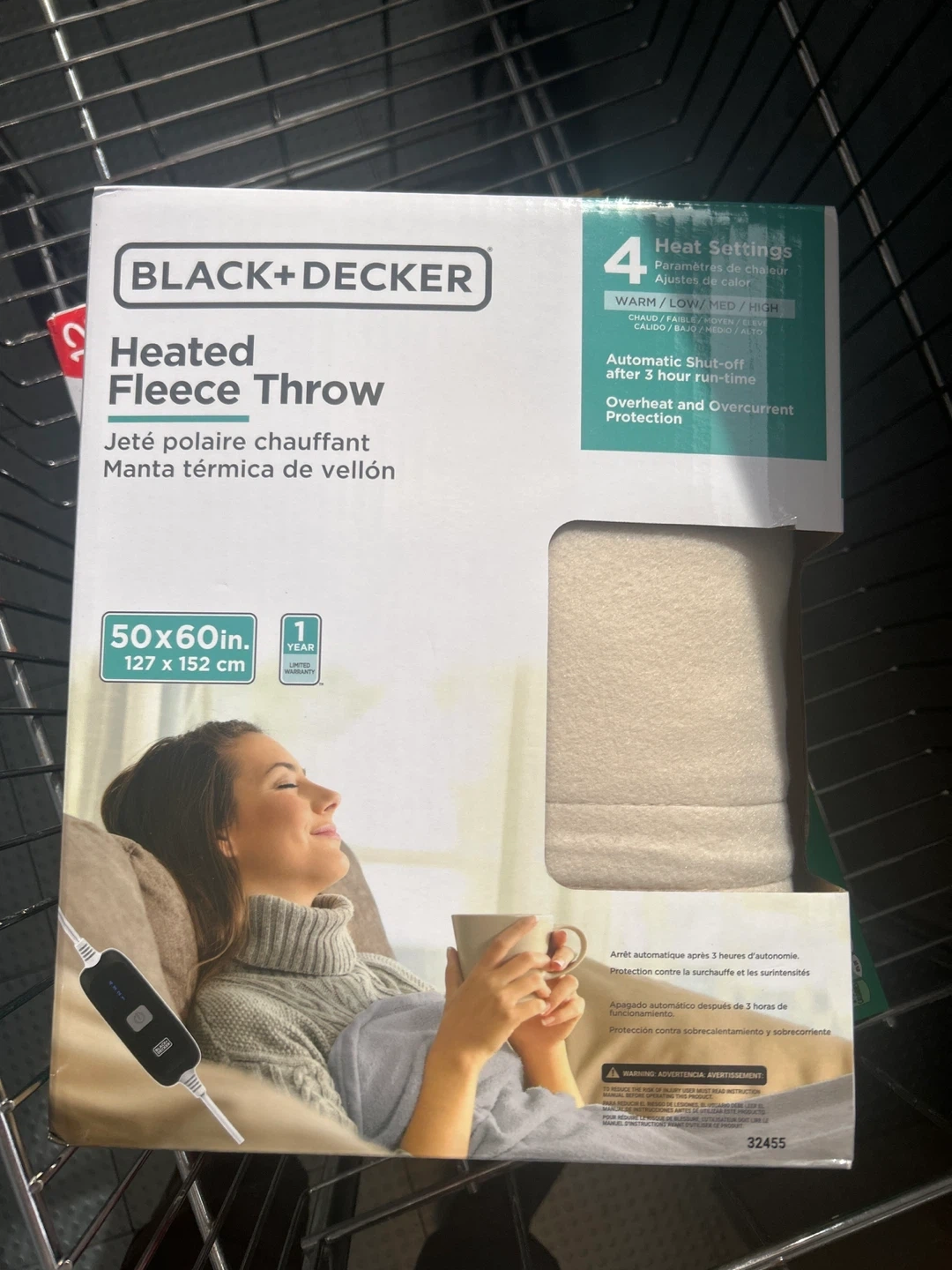 This BLACK+DECKER heated fleece throw is 50x60 inches. It features 4 heat settings and automatic shut-off after 3 hours. It also has overheat and overcurrent protection.