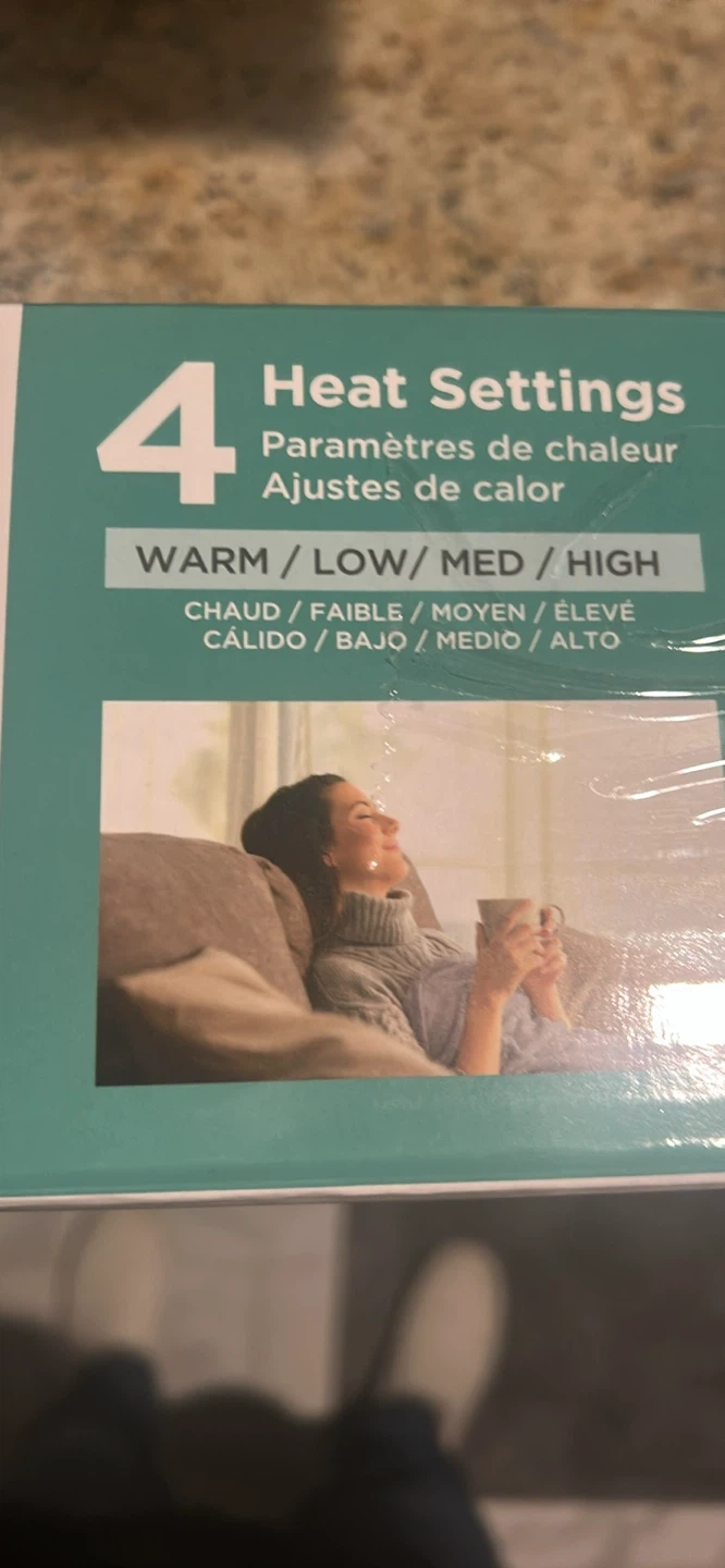 This BLACK+DECKER heated fleece throw is 50x60 inches. It features 4 heat settings and automatic shut-off after 3 hours. It also has overheat and overcurrent protection.
