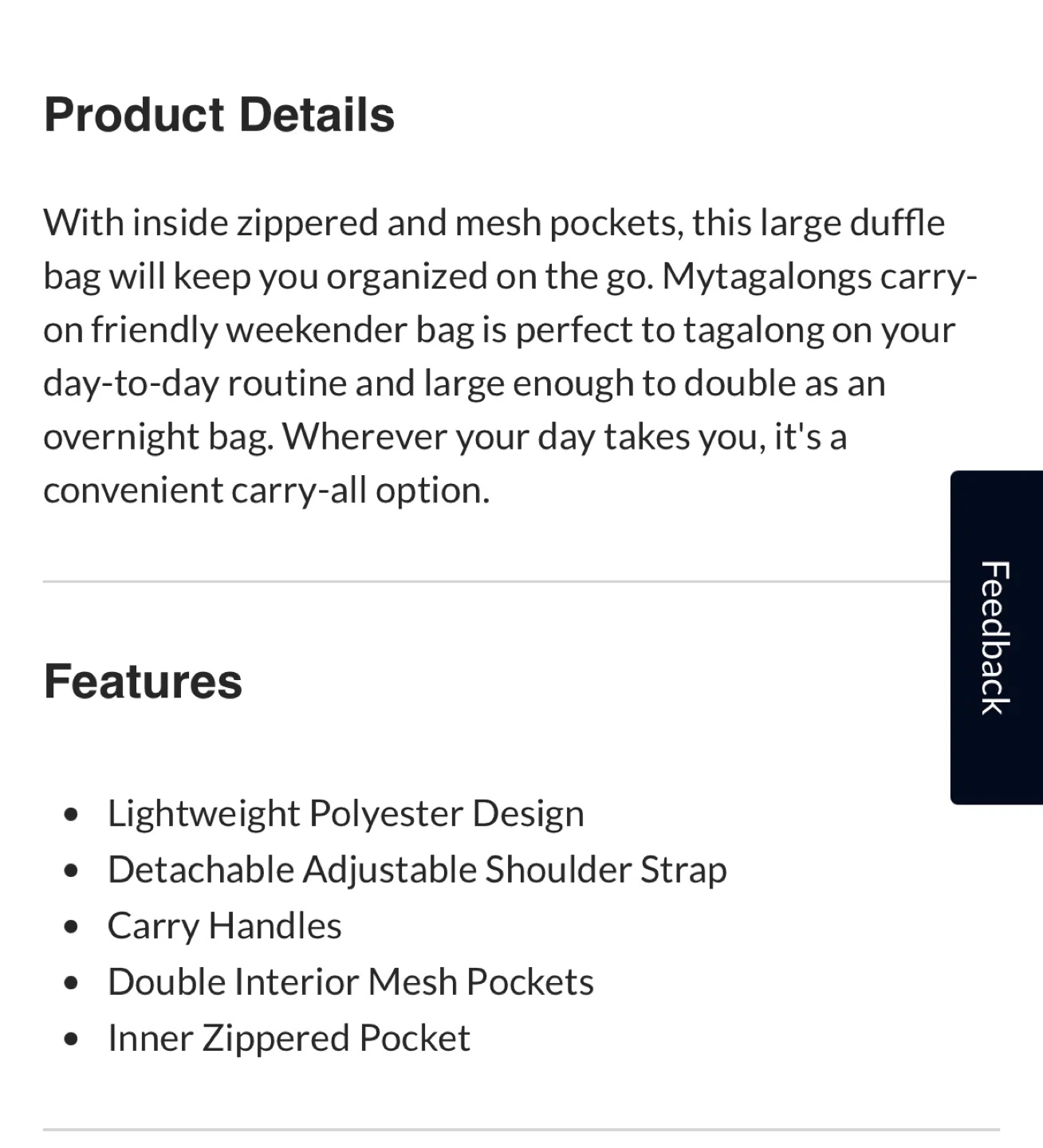 This MYTAGALONGS Cloud Duffle is a spacious carry-on bag perfect for weekend trips or daily use. It's made of a lightweight polyester design and features a detachable adjustable shoulder strap, carry handles, and multiple interior pockets for organization. Wherever your day takes you, it's a convenient carry-all option!