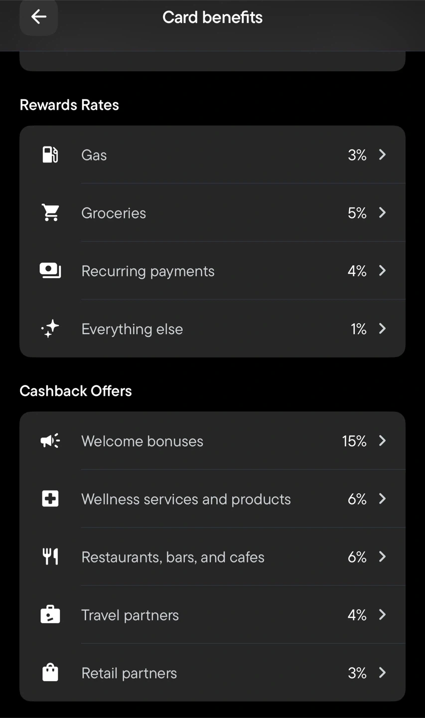 This is the Neo World Elite Mastercard, offering a 3% reward rate on gas and 5% on groceries. It also provides 15% cashback on welcome bonuses and 6% on wellness services and restaurants. Enjoy 4% on recurring payments and travel partners, plus 1% on everything else.