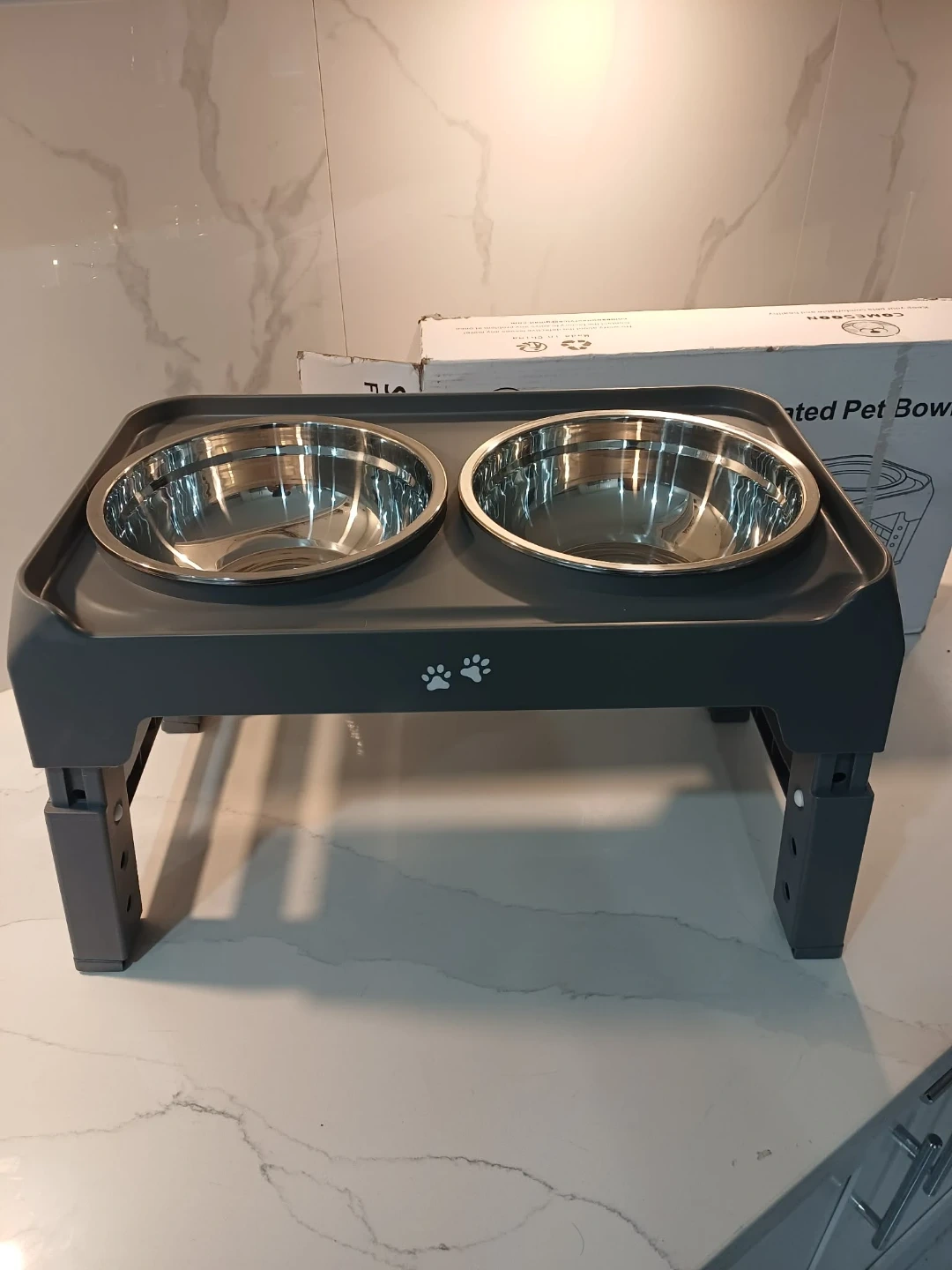 Selling a brand new set of COMESOON adjustable elevated pet bowls! These bowls are designed with a high-low sink design for easy access and anti-slip strips to keep them in place. The round corners help avoid any bruises, and the bowls are made of thickened stainless steel. Box included!