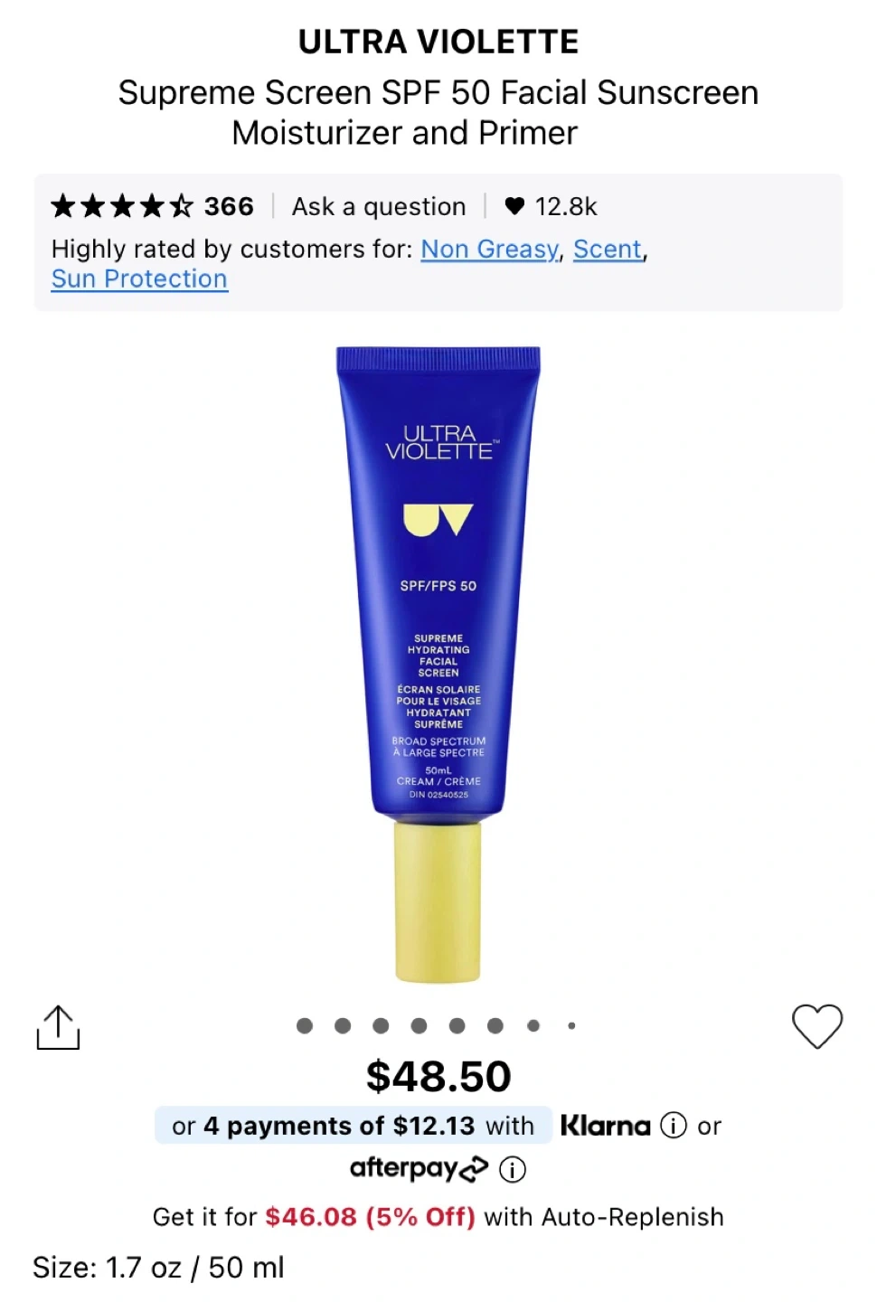 Selling an Ultra Violette Supreme Screen SPF 50 Facial Sunscreen. It's a hydrating sunscreen, perfect as a moisturizer and primer. It's highly rated for being non-greasy and providing excellent sun protection. Size is 50ml.