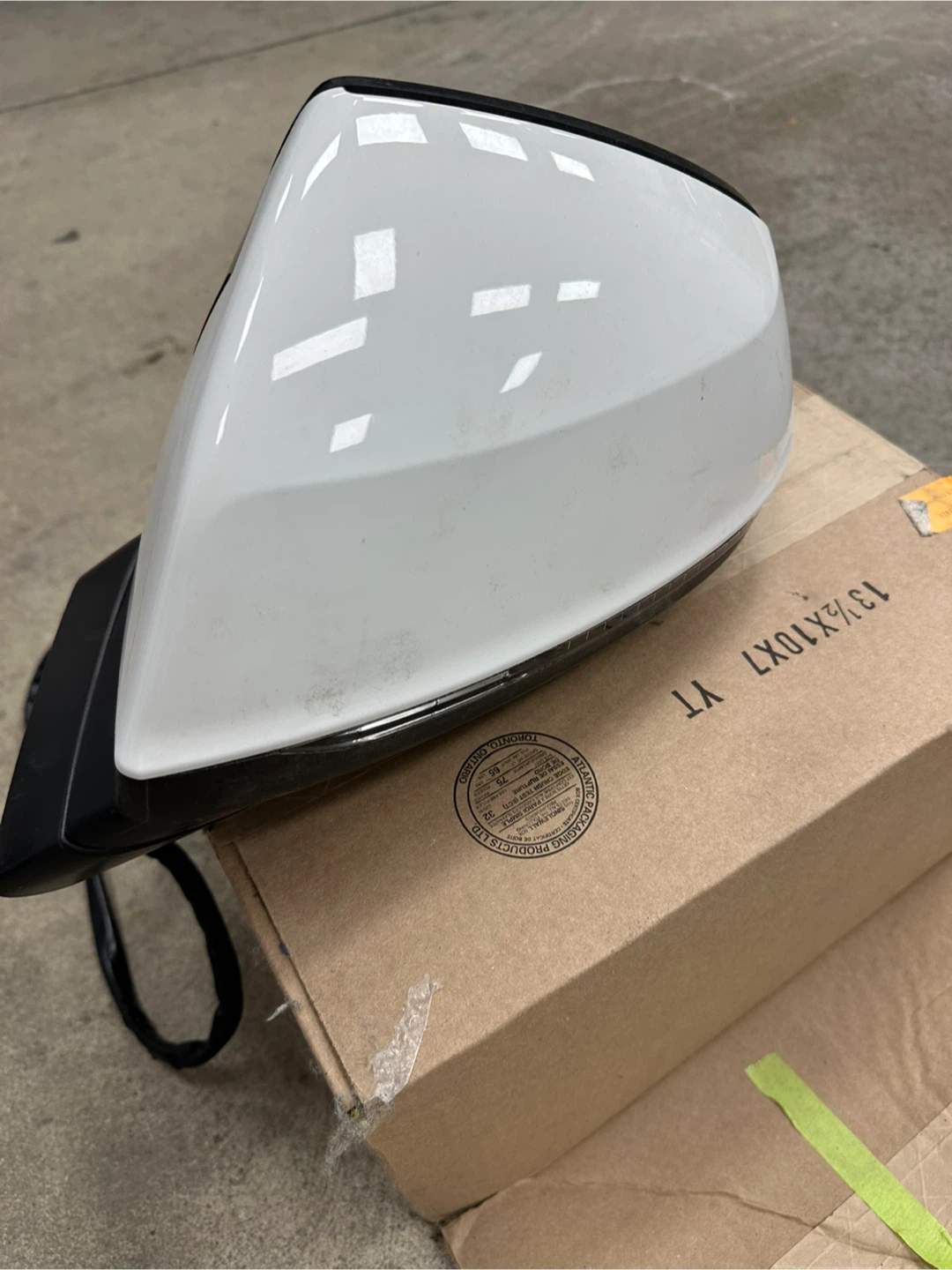 Selling a white car side mirror. Please note that there are some visible signs of wear and tear, including scratches and damage to the plastic frame. See photos for details! Everything works.