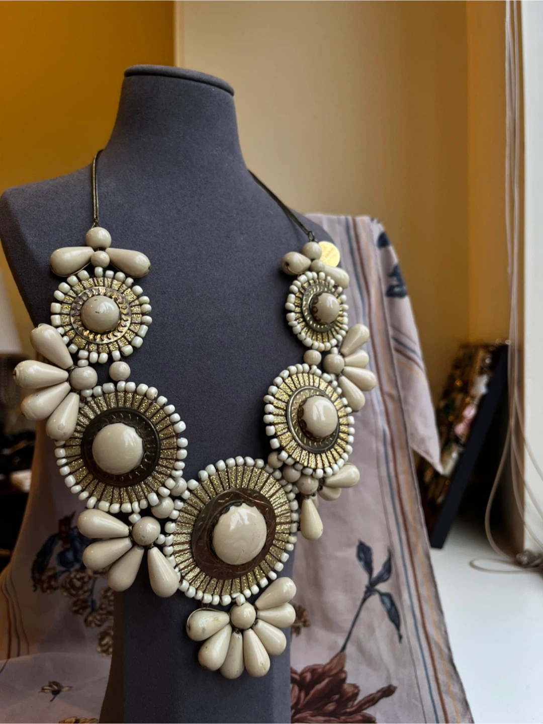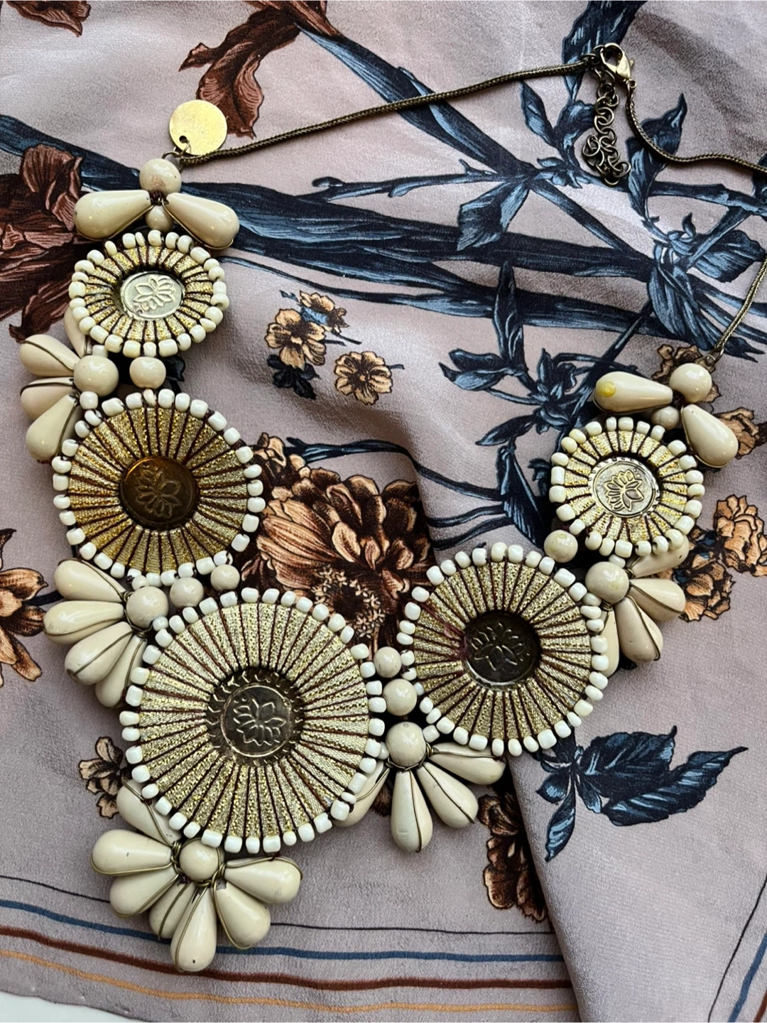 Selling a beautiful statement necklace with a unique floral design. It features beige and gold tones, making it a standout piece for any outfit. The necklace is in excellent condition and ready to add some flair to your wardrobe!