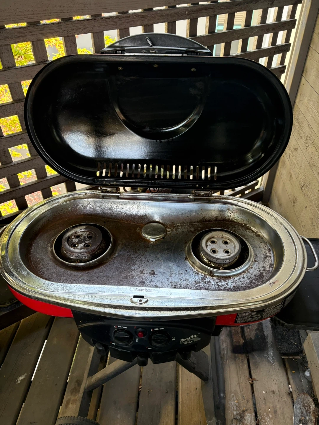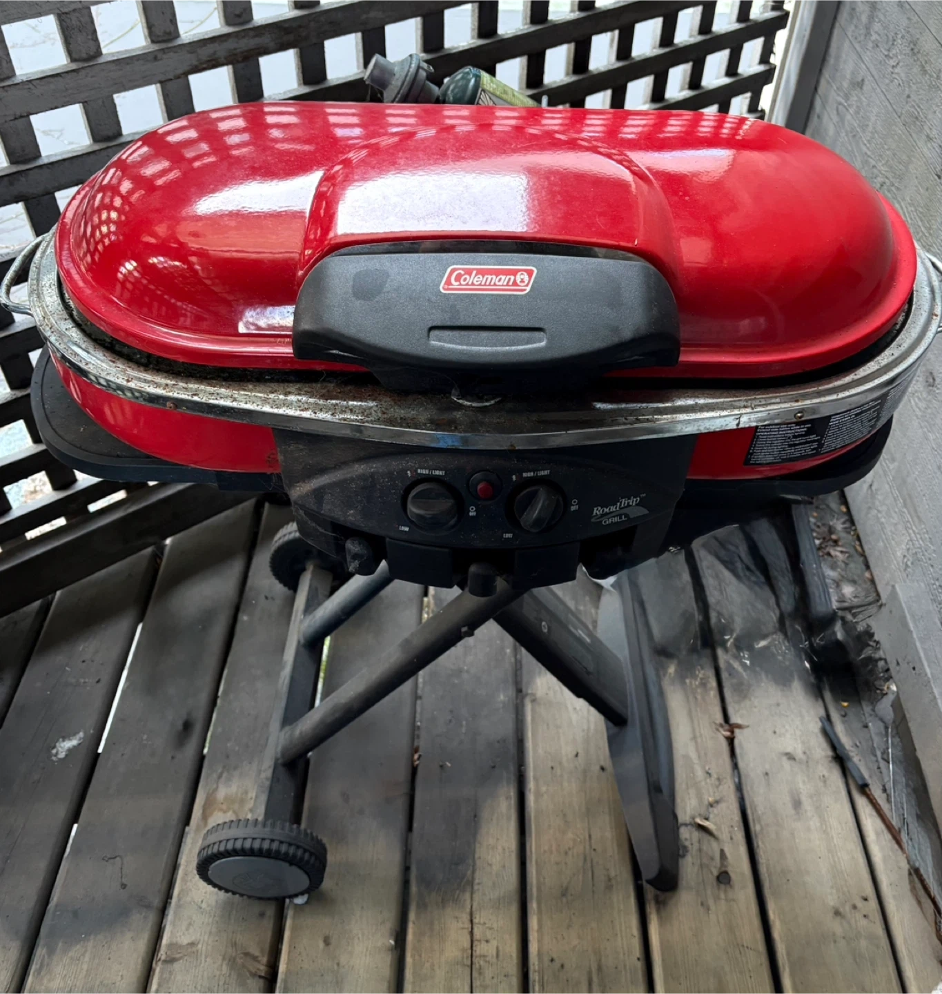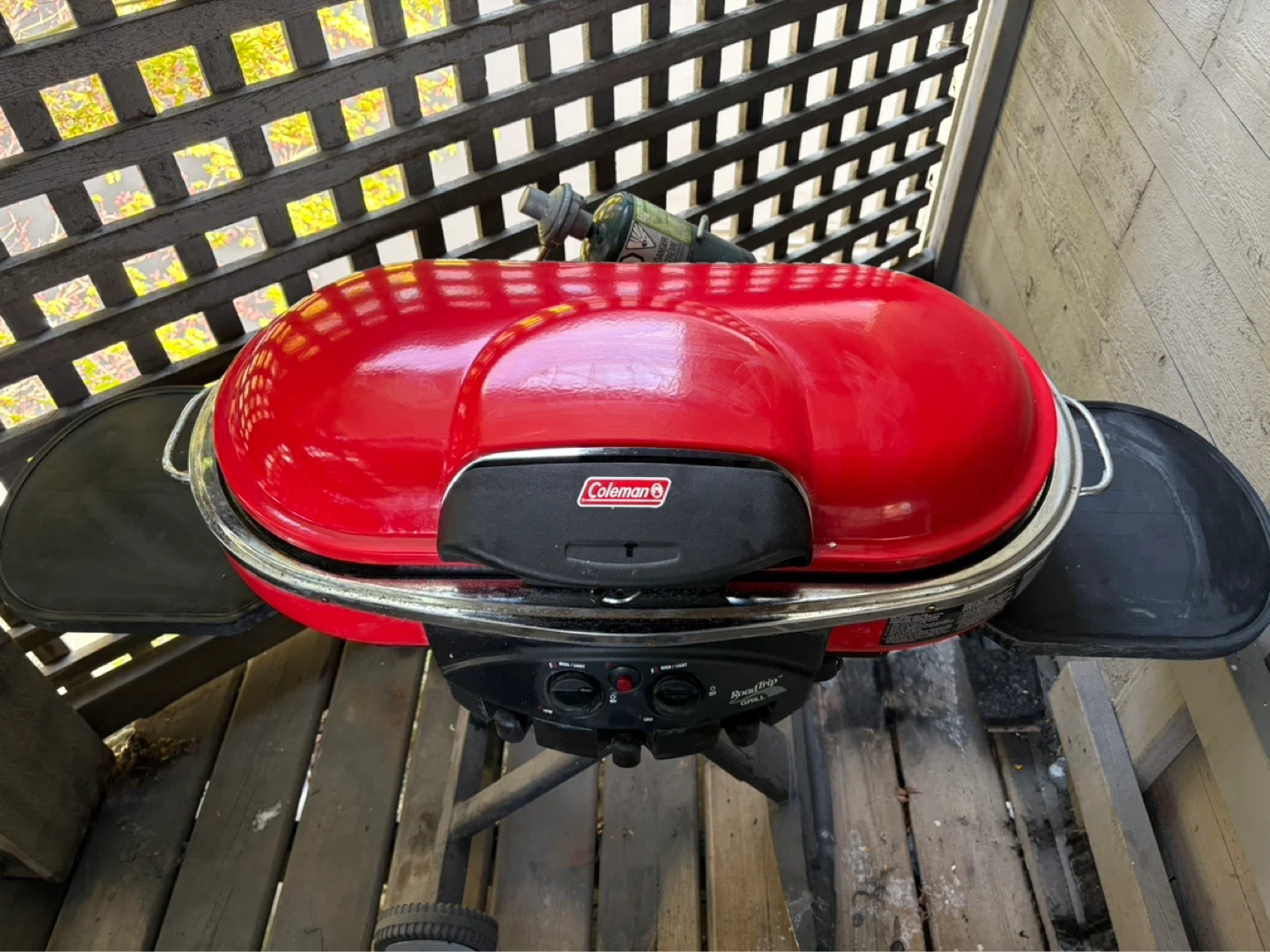 This is a red Coleman RoadTrip portable grill. Includes cover and 2 full 16 oz propane canisters. This grill is great for camping or backyard BBQs!