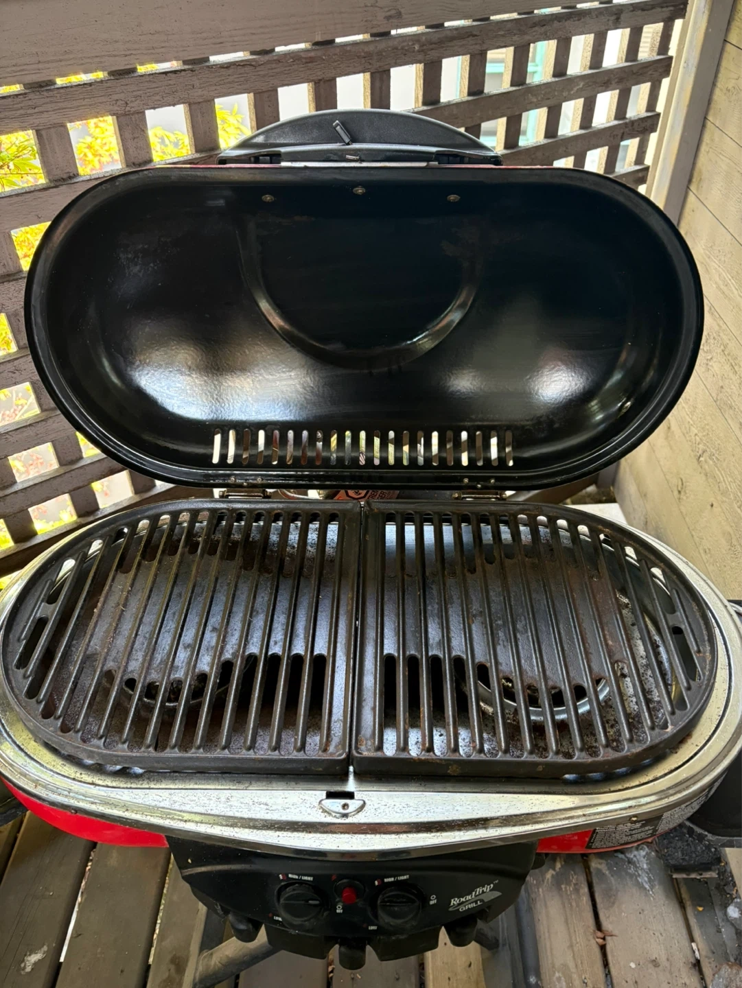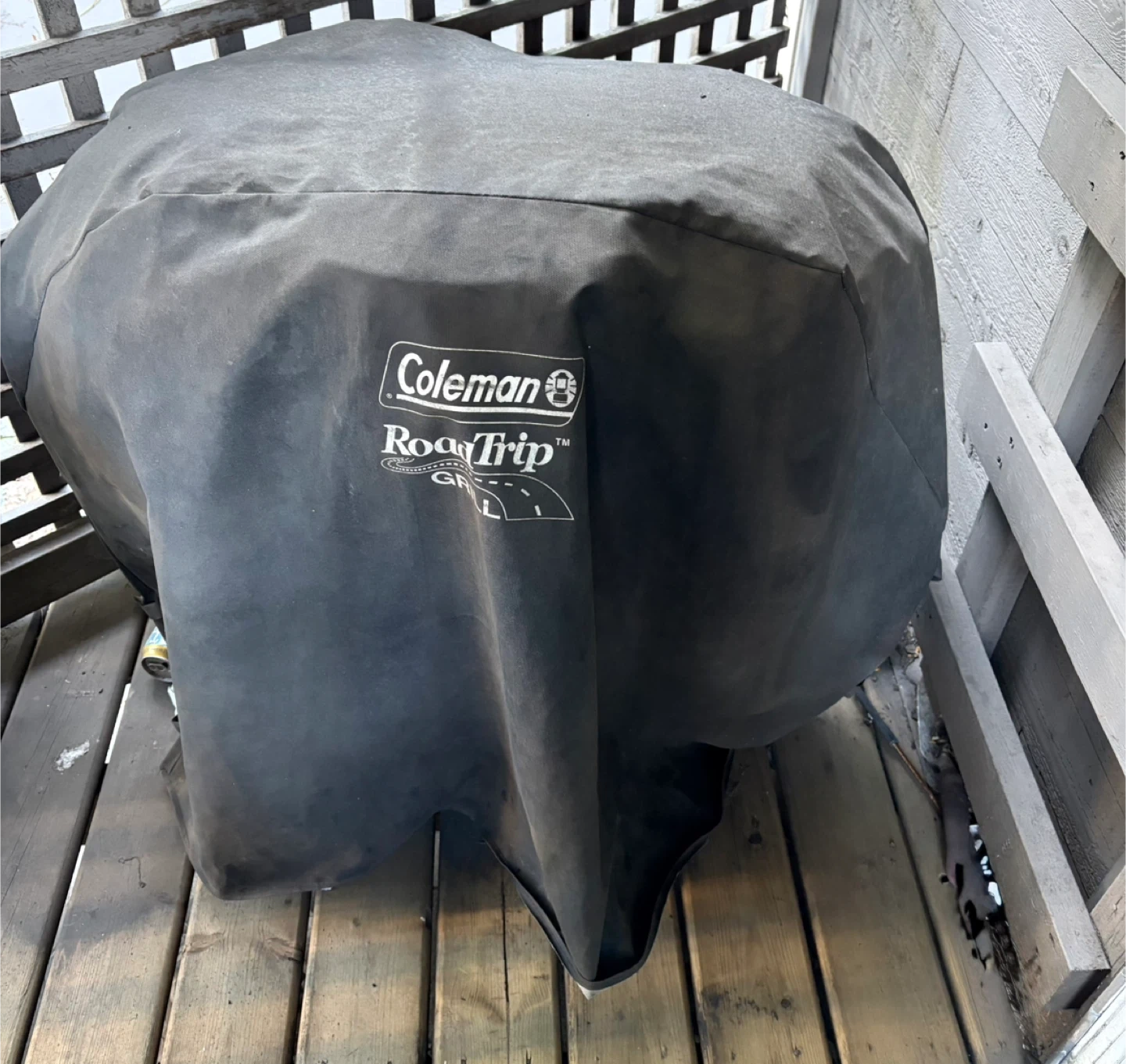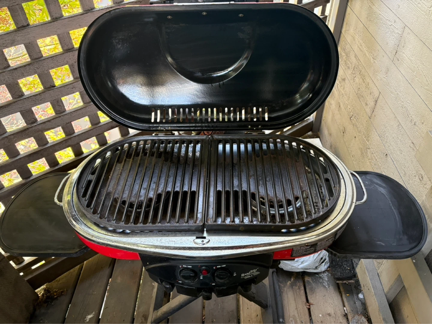 This is a red Coleman RoadTrip portable grill. Includes cover and 2 full 16 oz propane canisters. This grill is great for camping or backyard BBQs!