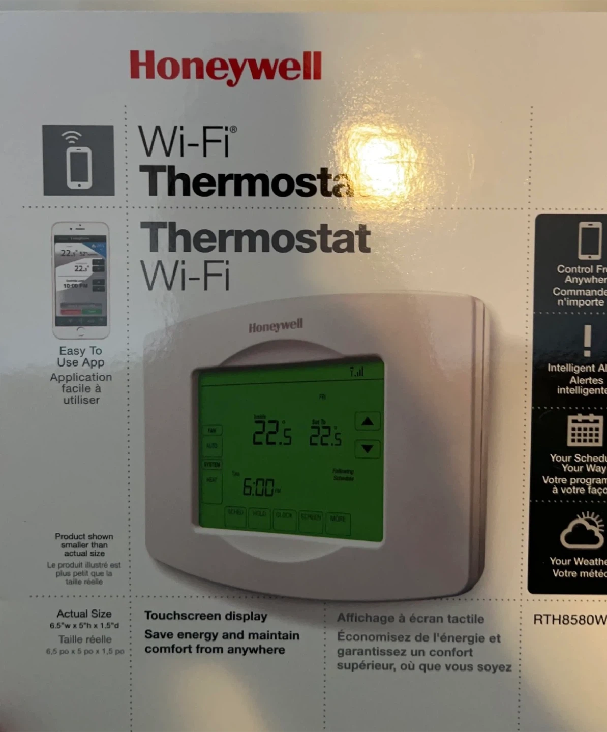 Honeywell Wi-Fi Thermostat with a touchscreen display. It measures 6.5"w x 5"h x 1.5"d. Save energy and maintain comfort from anywhere with this smart thermostat.