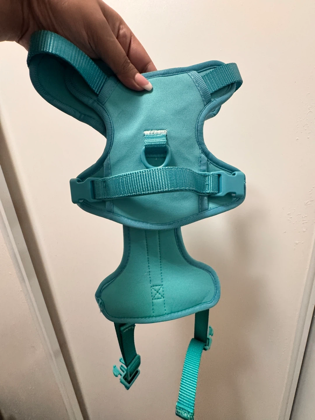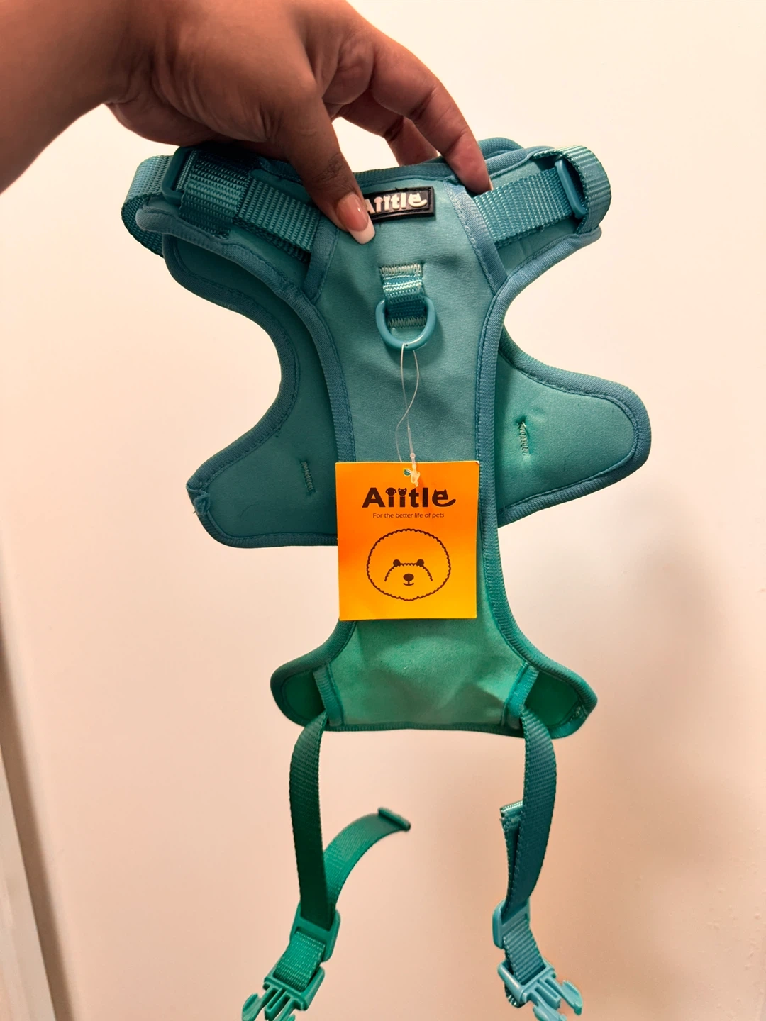 This teal A Little brand pet harness is made with durable materials. It features adjustable straps for a secure fit. Easy to put on your furry friend for walks!