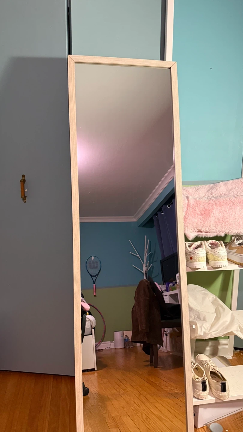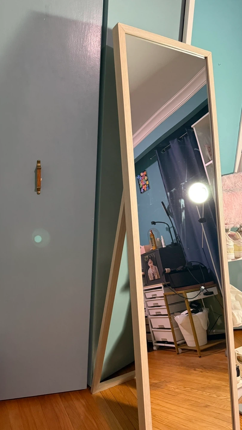 Tall standing mirror with a light wood frame. It's perfect for checking your full outfit before heading out. This mirror would be useful in a bedroom or dressing area.