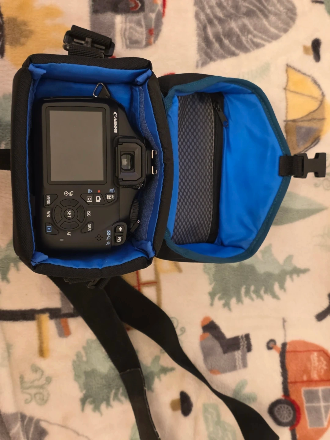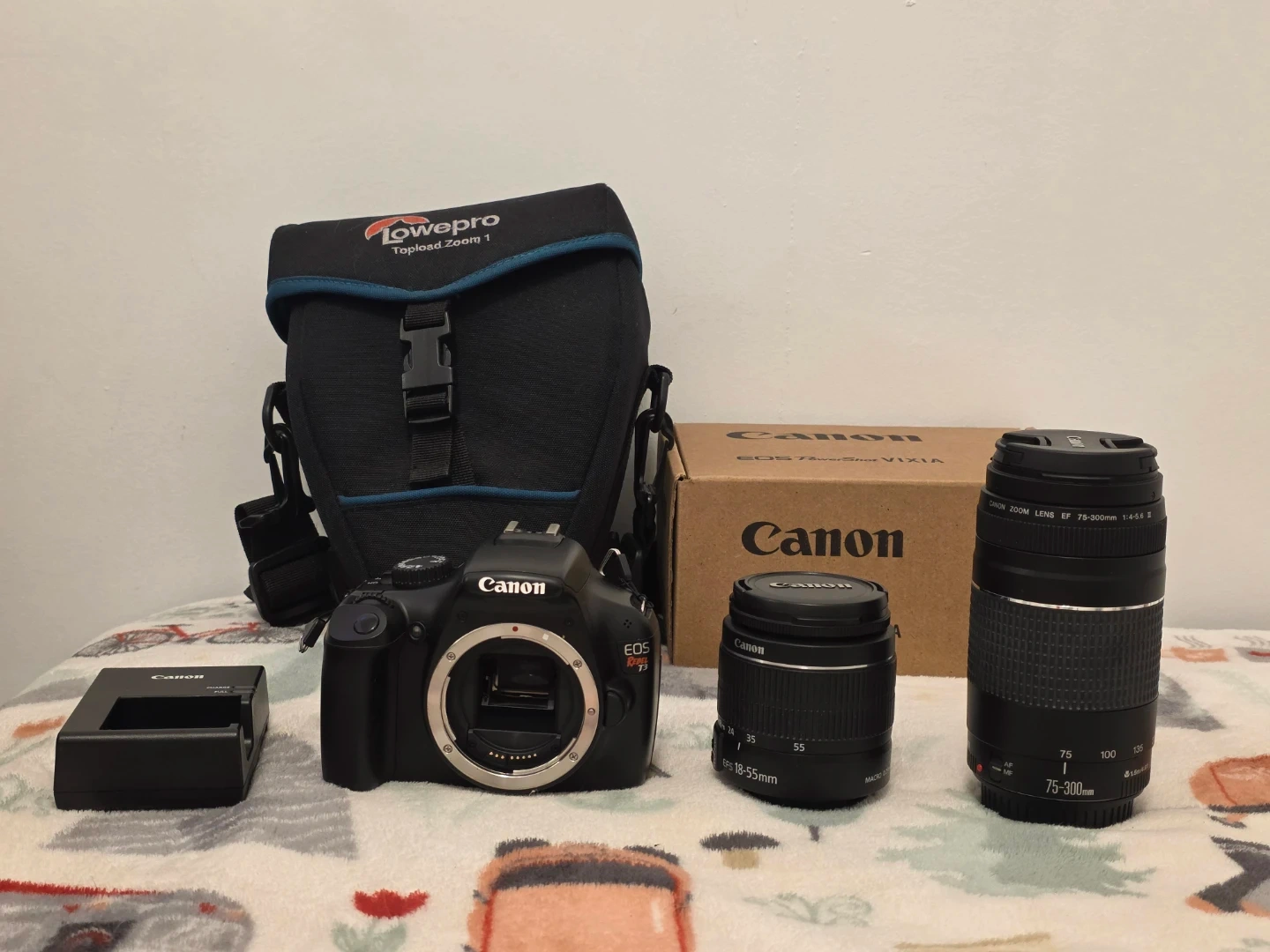 Selling a Canon EOS Rebel T3 DSLR camera kit. It includes the camera body, an EF-S 18-55mm f/3.5-5.6 lens, and an EF 75-300mm f/4-5.6 lens. Also comes with a Lowepro camera bag, battery charger, and original box for EF 75-300mm f/4-5.6 lens (Lens has been purchased from the official Canon Canada website).