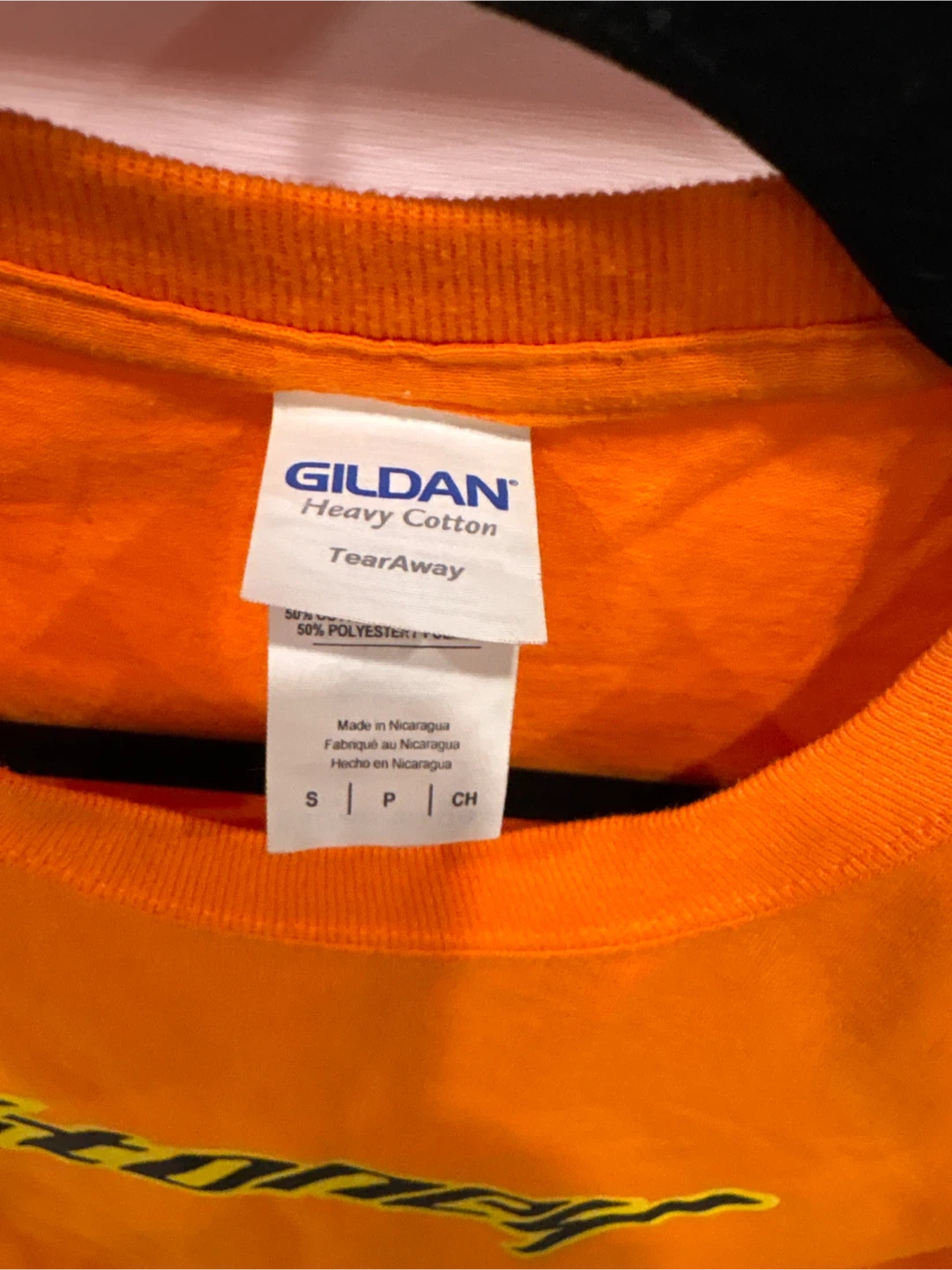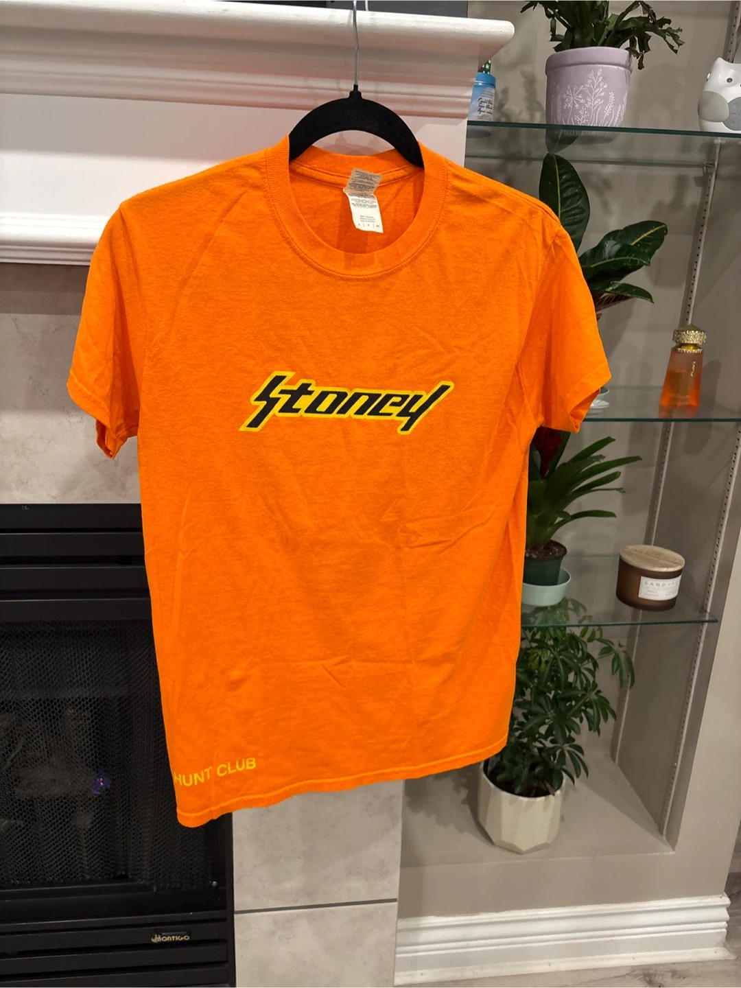 This is a Gildan Heavy Cotton t-shirt in orange. It features the 'Stoney' logo on the front and 'Hunt Club' on the lower left hem. It's made of 50% polyester and 50% cotton. Size S