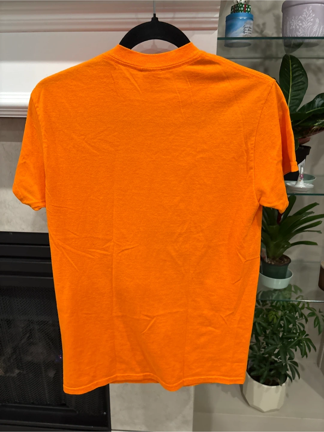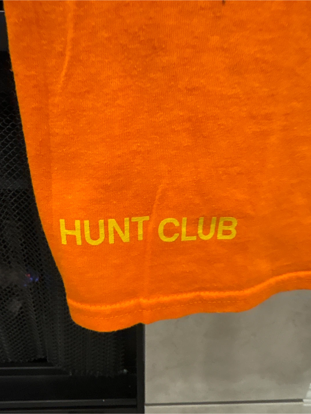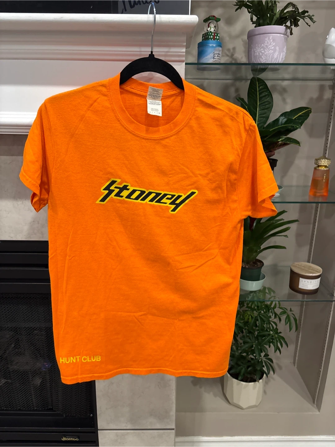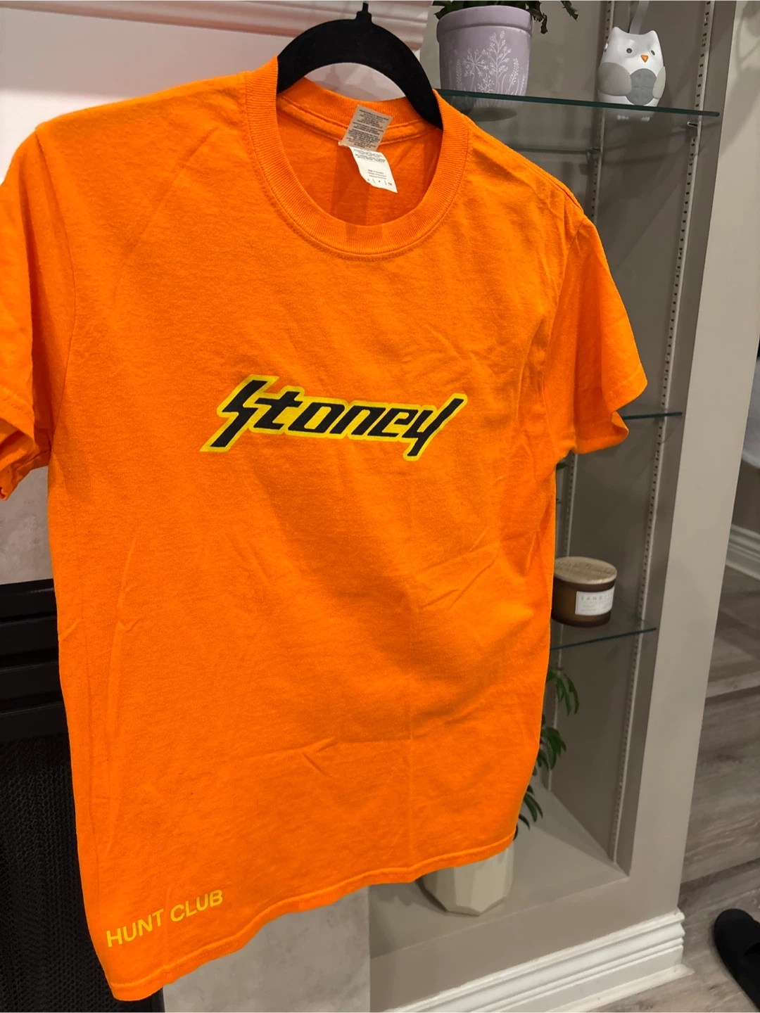 This is a Gildan Heavy Cotton t-shirt in orange. It features the 'Stoney' logo on the front and 'Hunt Club' on the lower left hem. It's made of 50% polyester and 50% cotton. Size S