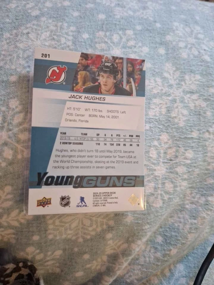 Awesome Jack Hughes Young Guns renewed hockey card. It's an Upper Deck card from the 2024-25 Series 2 set. Player is Jack Hughes for the Devils. Card number 201. Looks super clean, in a sleeve.
