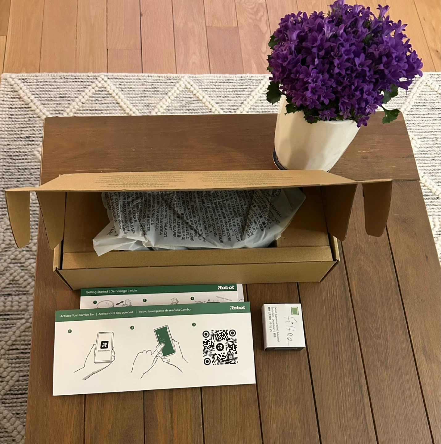 It comes with a charging dock, extra mob, filter and instructions. No box.
