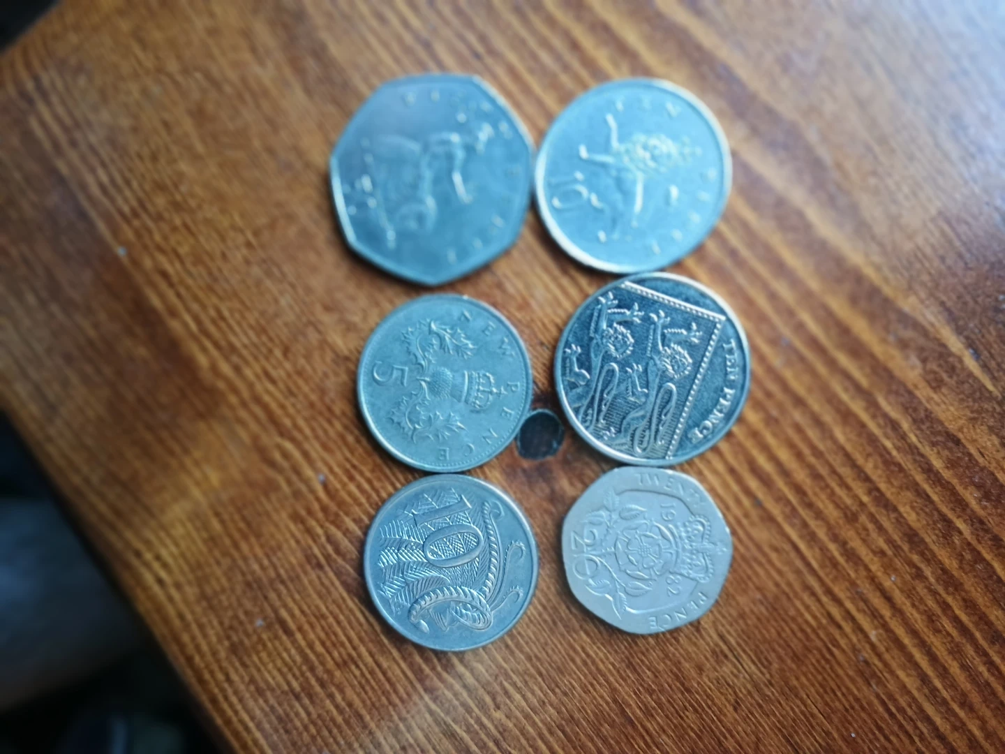 Six assorted coins including UK 50p, 10p, 2p, 1p and Australian 5c and 2c coins. All made of metal. These coins are great for starting a collection or for educational purposes.