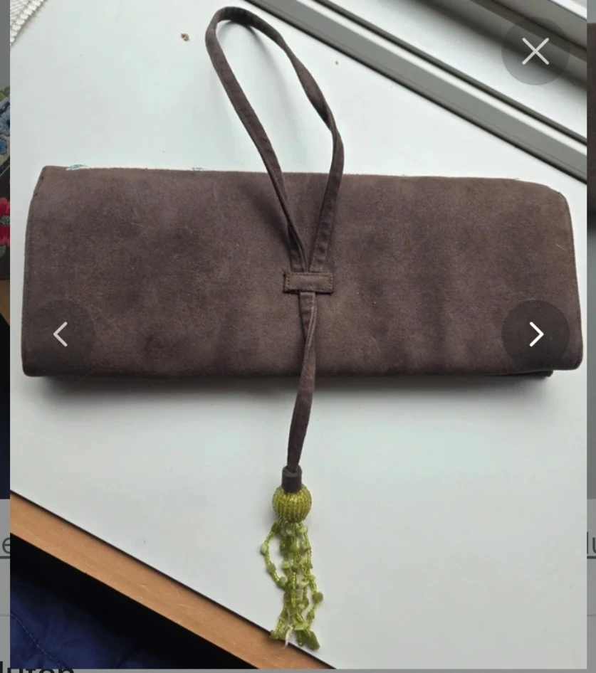 Brown clutch with intricate floral embroidery. Features a decorative beaded tassel detail and a wrist strap. Its rectangular shape makes it a versatile accessory.