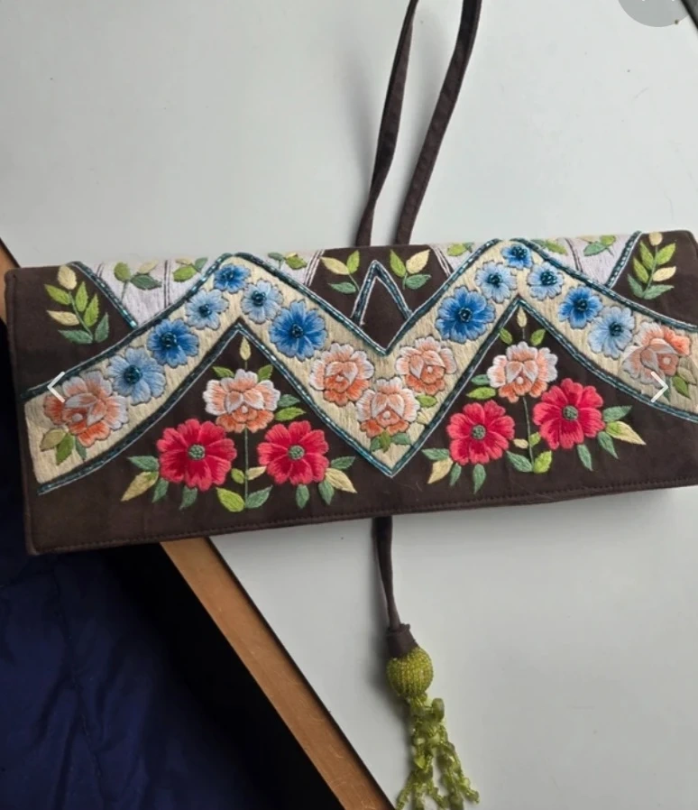 Brown clutch with intricate floral embroidery. Features a decorative beaded tassel detail and a wrist strap. Its rectangular shape makes it a versatile accessory.