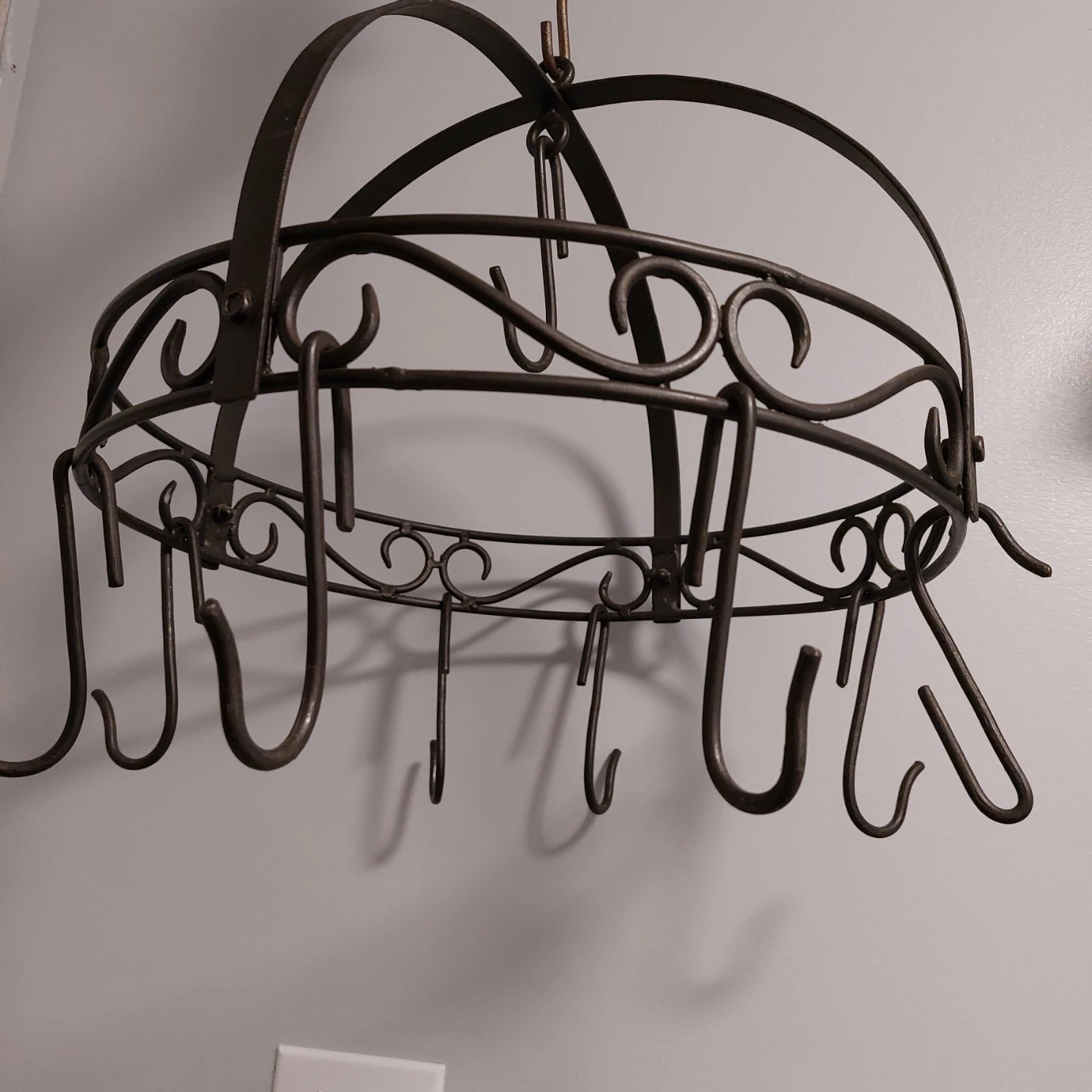 A metal pot rack with decorative scrollwork and multiple hooks. It's designed for hanging cookware and kitchen utensils. This rack could be useful for organizing a kitchen or for displaying pots and pans.