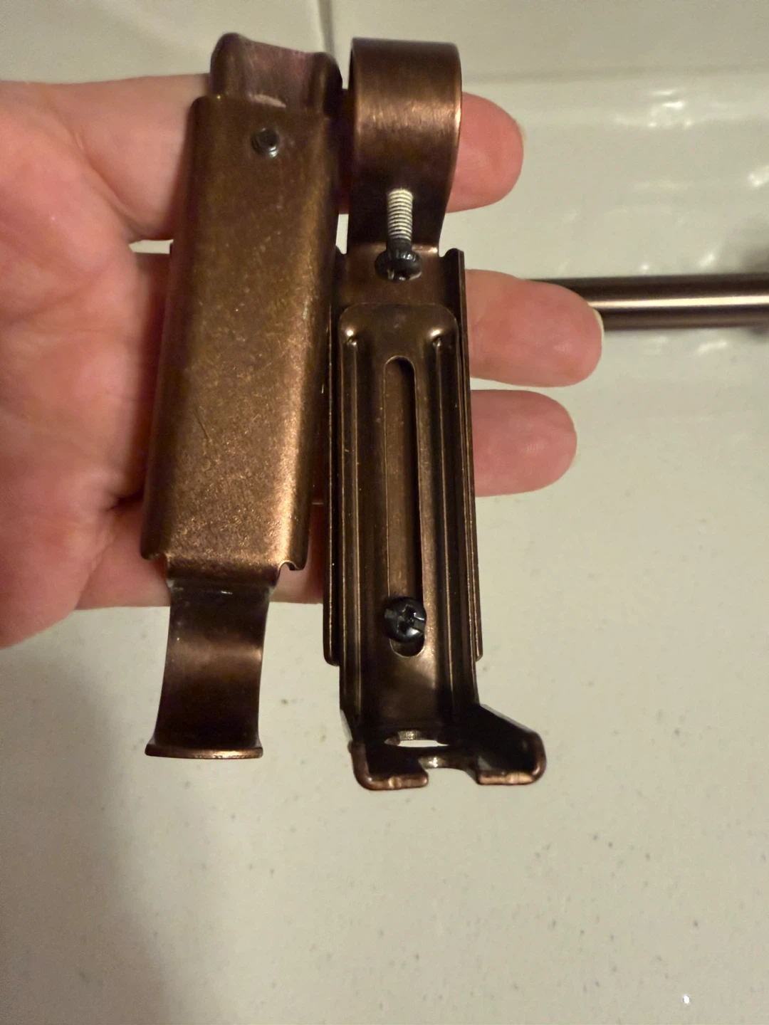 Adjustable strong curtain rod in a copper/bronze metal finish. Includes decorative finials, and mounting brackets. Measures 26” non extended without finials or 32.5” with them.