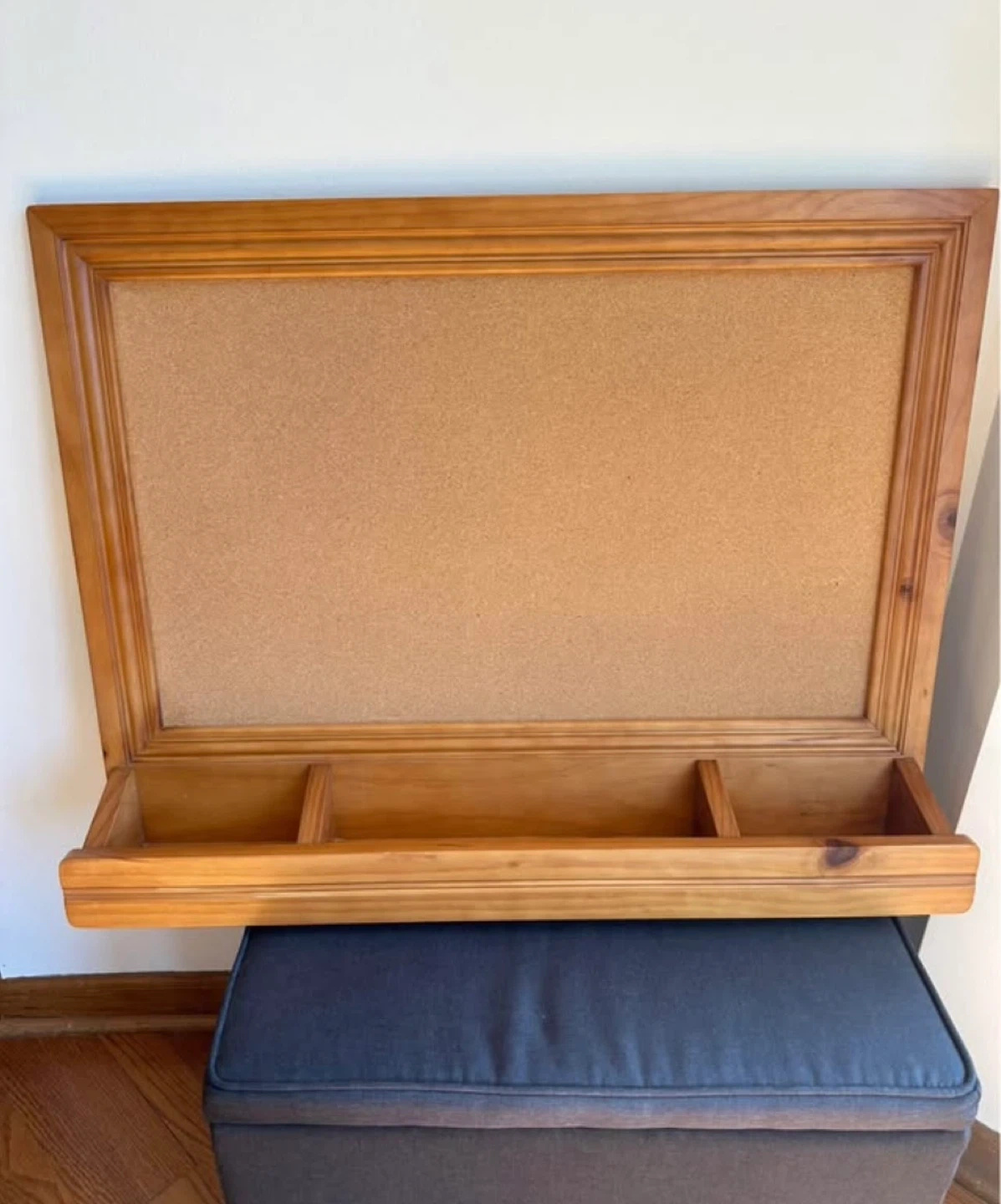 This wooden wall shelf/trophy case features a corkboard backing and three divided compartments at the bottom. It includes three hooks below the compartments. Its natural wood finish complements many decor styles.