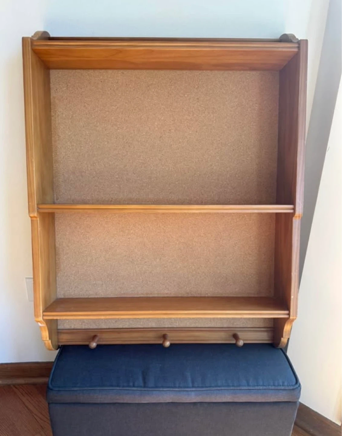 This wooden wall shelf/trophy case features a corkboard backing and three divided compartments at the bottom. It includes three hooks below the compartments. Its natural wood finish complements many decor styles.