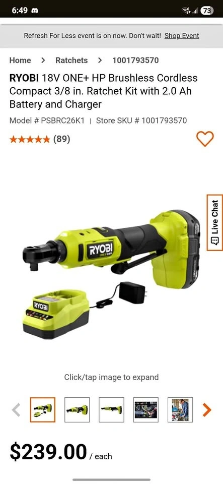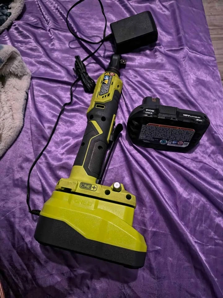 Will be cleaned for pick-up. RYOBI 18V ONE+ HP Compact Brushless 3/8 in. High Speed Ratchet Kit with 2.0 Ah Battery and Charger. Features variable speed metal paddle trigger, 3/8 in. anvil with pin detent, 20% more compact ratchet head for access to tight spaces, 4-position rotating head, up to 40 ft./lbs. of torque, ONE+ HP Technology for up to 2X more speed with up to 460 RPM, and dual on-board LED worklights.
