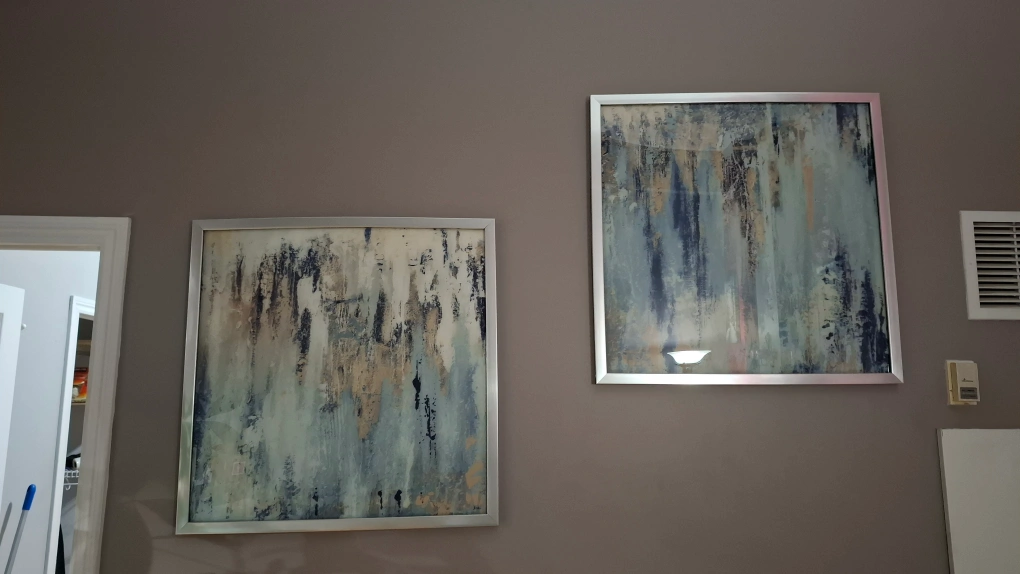 Selling a set of two framed abstract wall art pieces. They feature a blend of blues, greys, and beige tones, perfect for adding a touch of modern elegance to any room. The frames have a sleek, silver finish. They are in great condition and ready to hang!