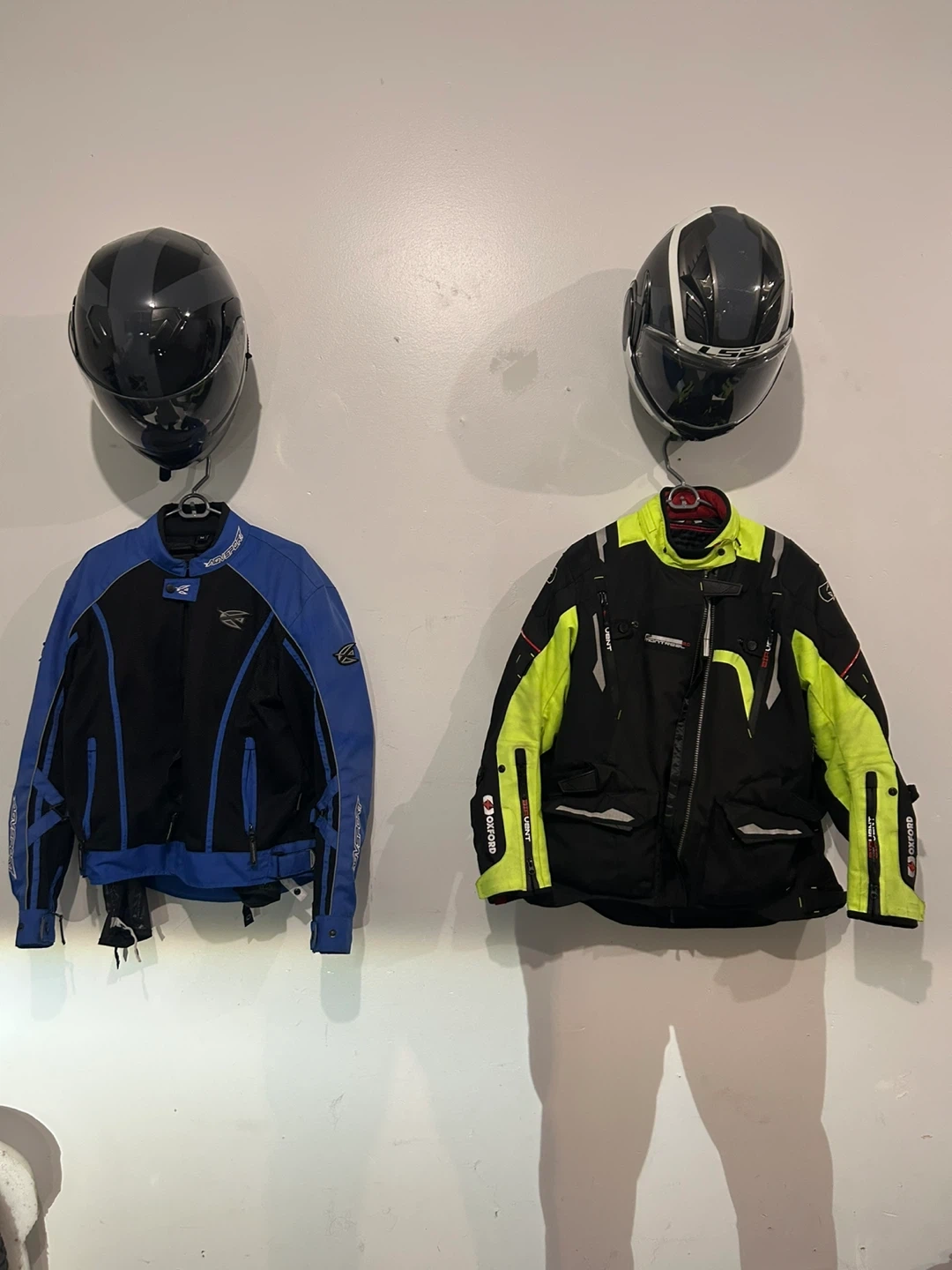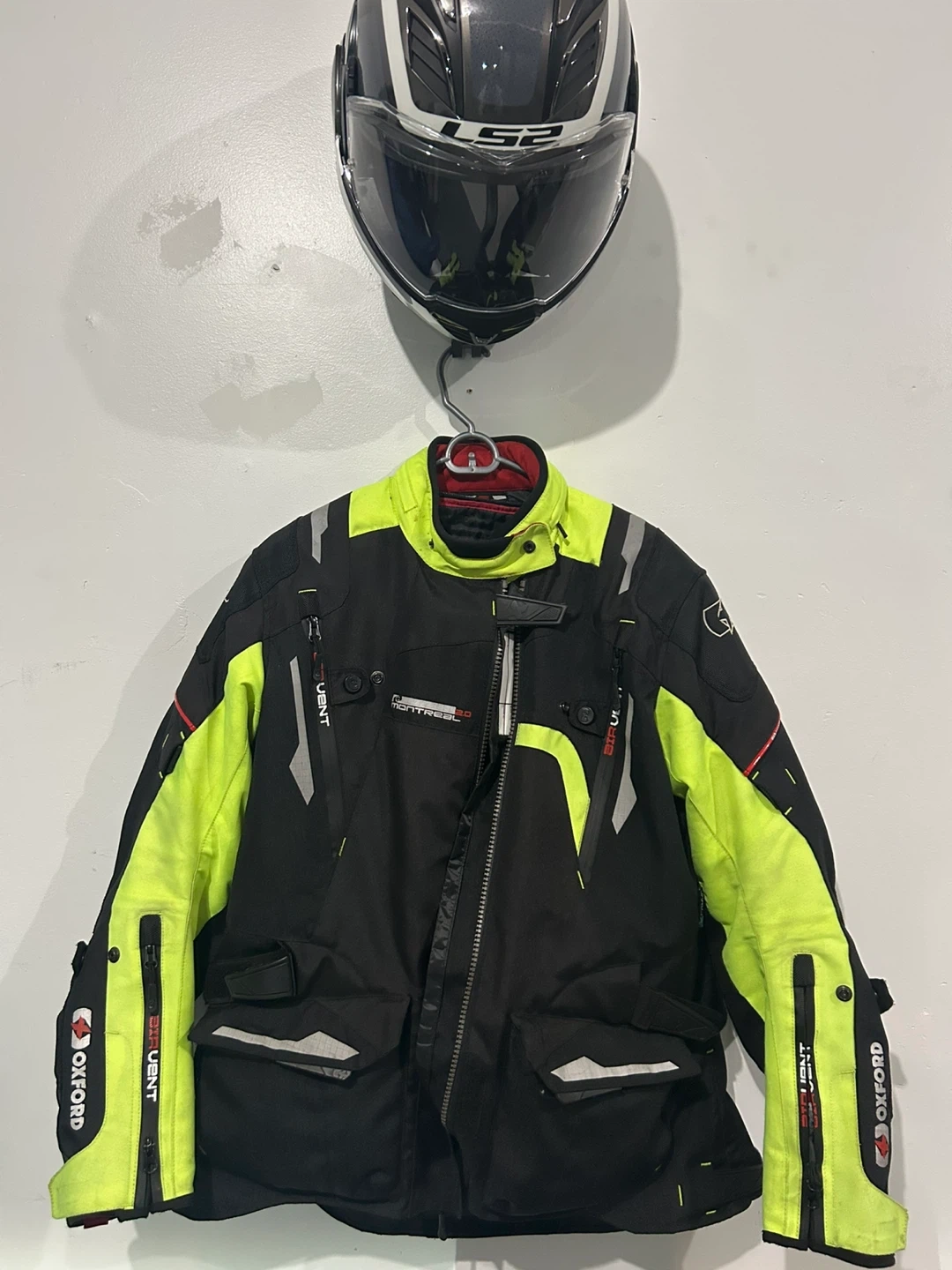 2 jackets, 2 helmets, 2 helmet mount stands. This is a high-visibility Oxford motorcycle jacket with reflective accents. It also includes an LS2 motorcycle helmet. Both are in good condition.
